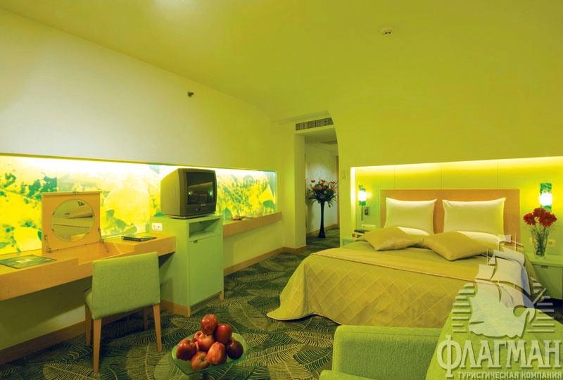 - 80 однокомнатных villa junior suite (расположены вокруг собственного бассейна, гостиная, спальня без двери, ванная с джакузи и душем, прямой выход к бассейну, к услугам гостей – отдельный ресторан: завтрак, обед (снеки) и бар в течение дня, макс. 2+2 чел., 50 м2).