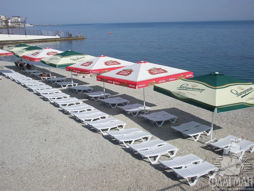 Арендованный, галечный пляж в 500 м от пансионата. Пляж оборудованный (зонты, раздевалки, шезлонги – за доп. плату), прокат пляжного инвентаря.