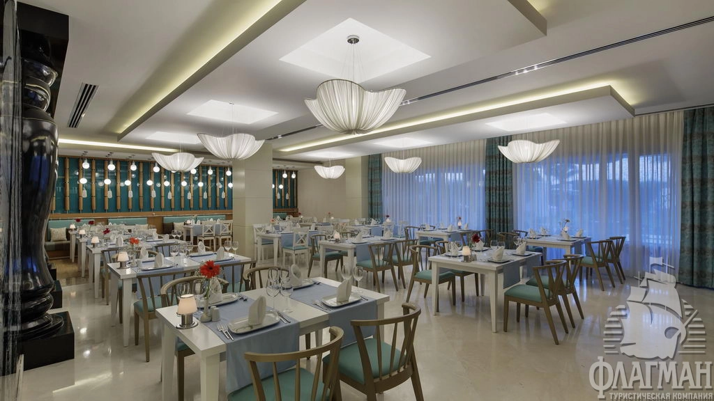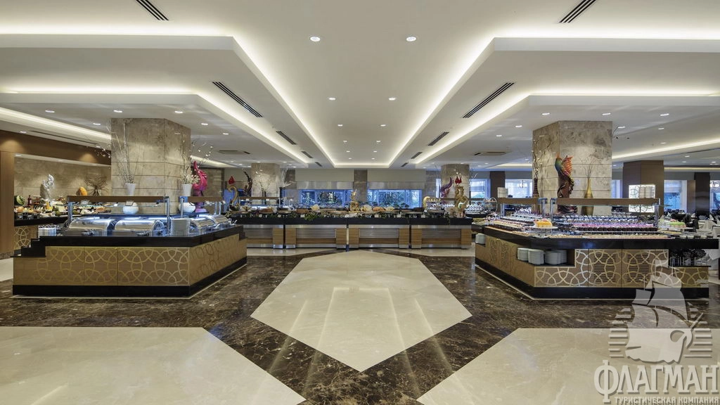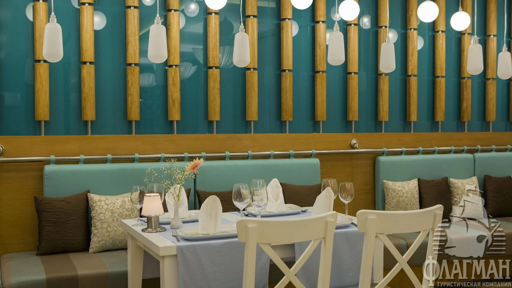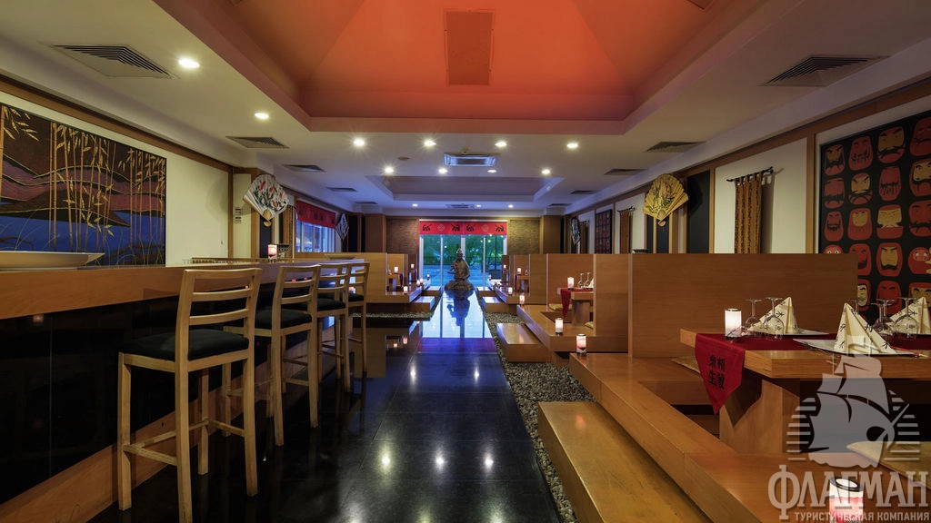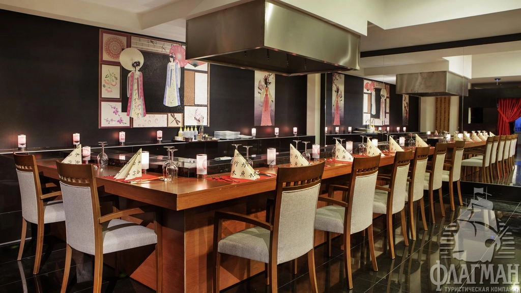 - рестораны a la carte: 5 (итальянский, рыбный, турецкий, мексиканский, дальневосточный – по предварительной записи, при проживании не менее 7 дней - посещение один раз в неделю бесплатно. При проживании менее 7 дней – плата за резервацию)