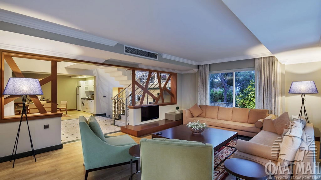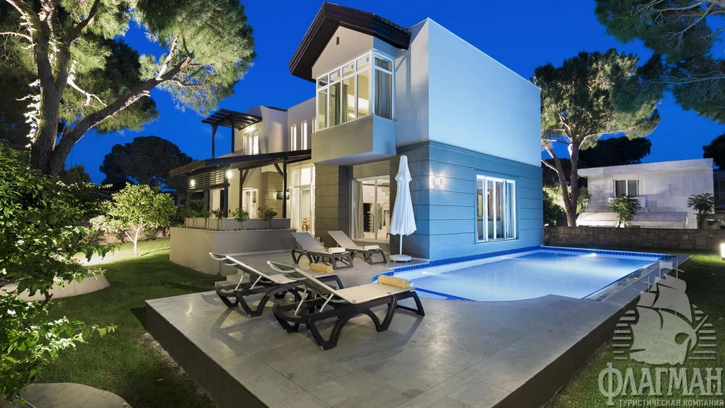 4 двухэтажных deluxe villa (на первом этаже: гостиная с кухней (оборудована обеденной зоной и мягкой мебелью), терраса, телевизор, ванная, спальня с дверью; на втором этаже: 2 спальни с дверью, 2 ванные комнаты; приватный открытый бассейн, макс 6 чел., 175 м2),