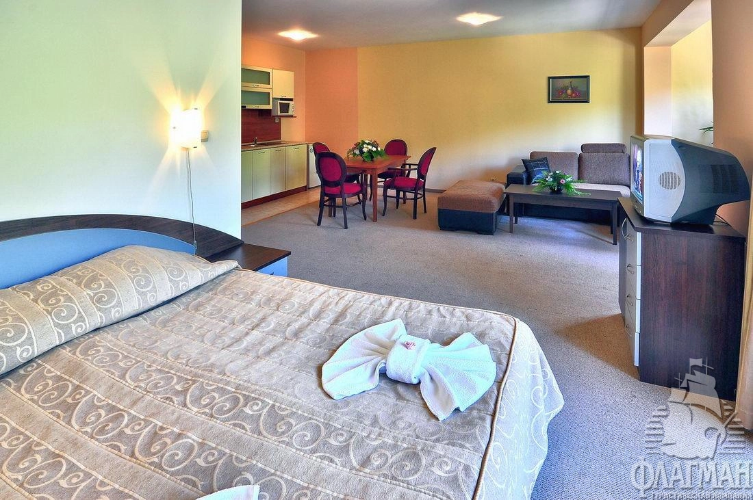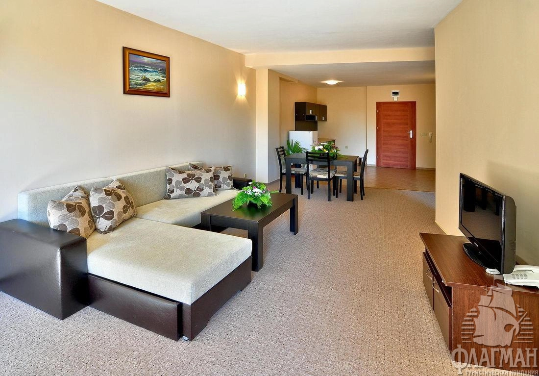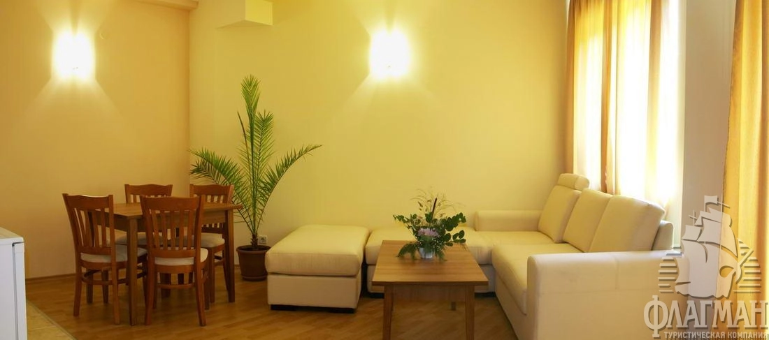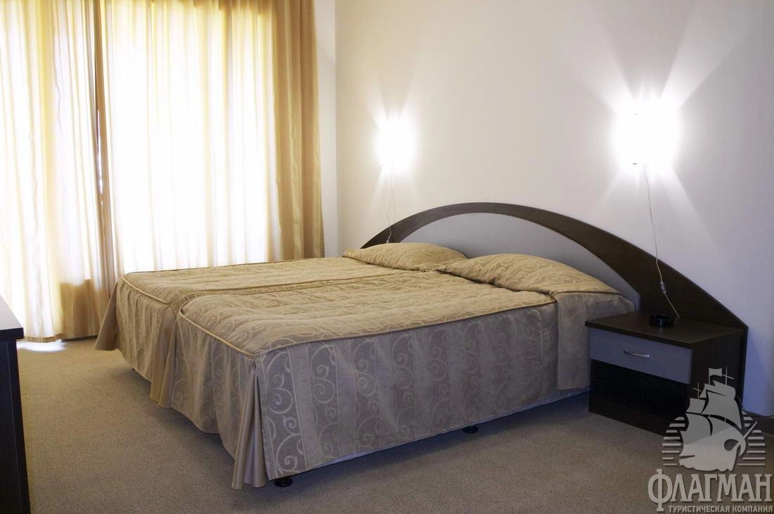 В курортном комплексе Золотые пески, в 25 км от аэропорта города Варна, в 300 м от центра курорта, в 600 м от плажа.