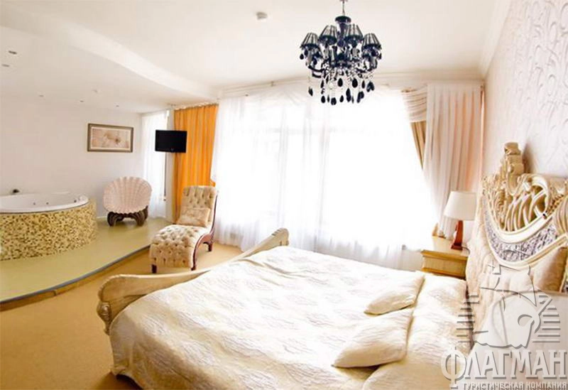 - 2-местный "Хрусталь" (макс. 2+2 чел., телевизор, кондиционер, душ, туалет, биде, джакузи, фен, балкон, мини-бар, телефон, 2-спальная кровать). Доп. место - еврораскладушка.