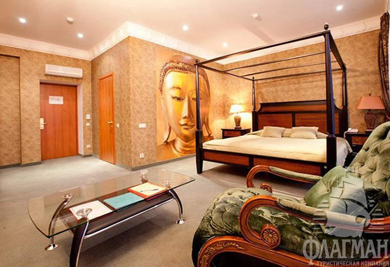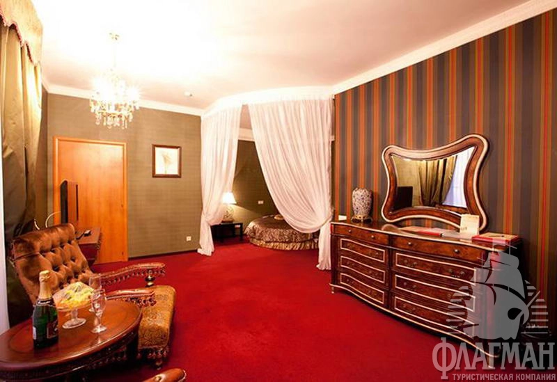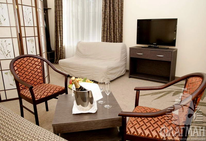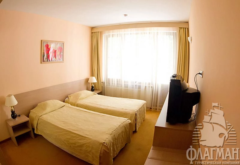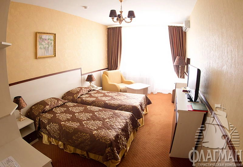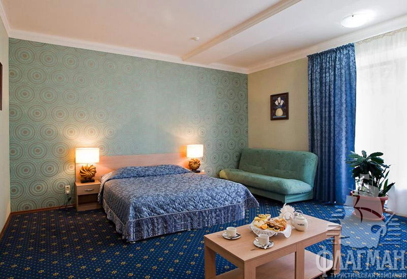 - 2-местный "Турмалин" (макс. 2+2 чел., телевизор, кондиционер, душ, туалет, биде, джакузи, фен, мини-бар, телефон, 2-спальная кровать). Доп. место - еврораскладушка.