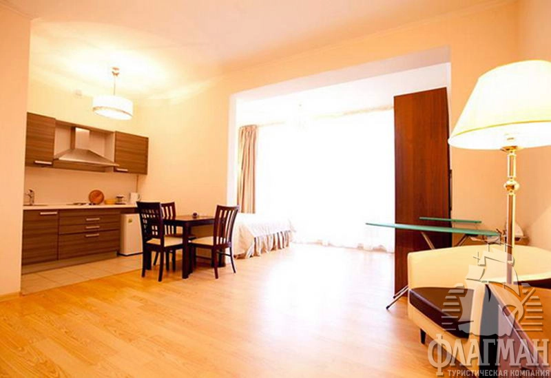 - 2-местный студио (макс. 2+1 чел., 27-36 кв. м, телевизор, кондиционер, ванна, туалет, фен, банные принадлежности, мини-бар, телефон, мягкая мебель, шкаф/гардероб, две 1,5-спальные кровати). Доп. место - еврораскладушка.