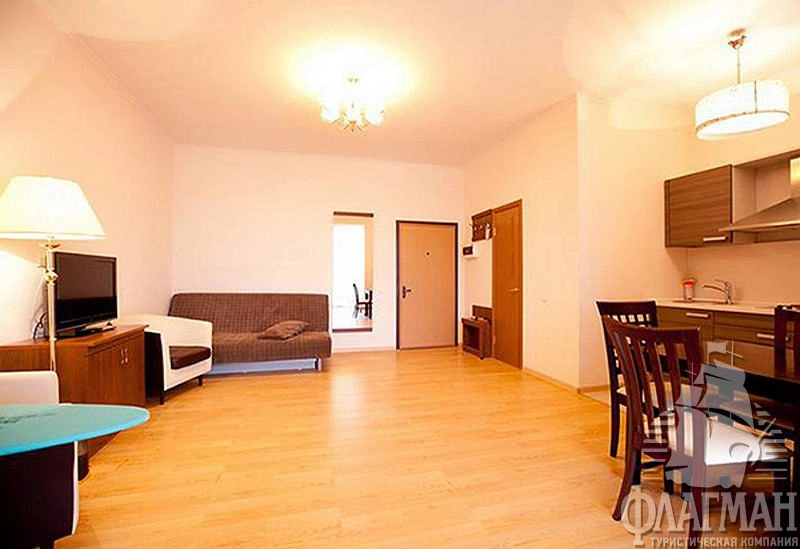 - 2-местный 2-комнатный апартамент супериор (макс. 2+2 чел., 60-65 кв. м, телевизор, кондиционер, душ/ ванна, туалет, холодильник, банные принадлежности, балкон, кухня / мини-кухня, набор посуды, мягкая мебель, шкаф/гардероб, две 1,5-спальные кровати). Доп. место - диван-кровать.