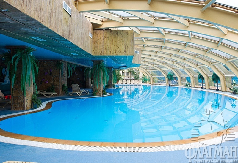 - 1 крытый бассейн. Платно: (Аквацентр: гейзеры, водопады, два взрослых бассейна (релакс с гидромассажными местами и актив), водные горки для взрослых, детский бассейн с горкой и фонтаном "бегемотик". Вода подсвечивается подводными прожекторами. Производится постоянный подогрев и контроль температуры и воздуха.).