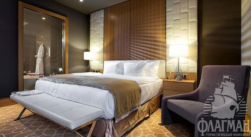 Deluxe Room - Площадь номера 47 м2. Просторный однокомнатный элегантный номер с балконом, в интерьере которого читается гармоничный синтез стилей лофт и ар нуво: простота, пластическая выразительность, изящество, приглушенно-мягкие объемные тона и яркие пятна в качестве акцентов. Соседство ультрасовременных материалов и техники с элементами сложного декора и старинными предметами делает интерьер оригинальным. В номере: бесплатный WIFI и проводной интернет, LCD телевизор c опциями интерактивного телевидения, IP телефония, сейф, рабочий стол с индивидуальным освещением, теплое и холодное кондиционирование, ванная и душ в ванной комнате, подогрев пола.