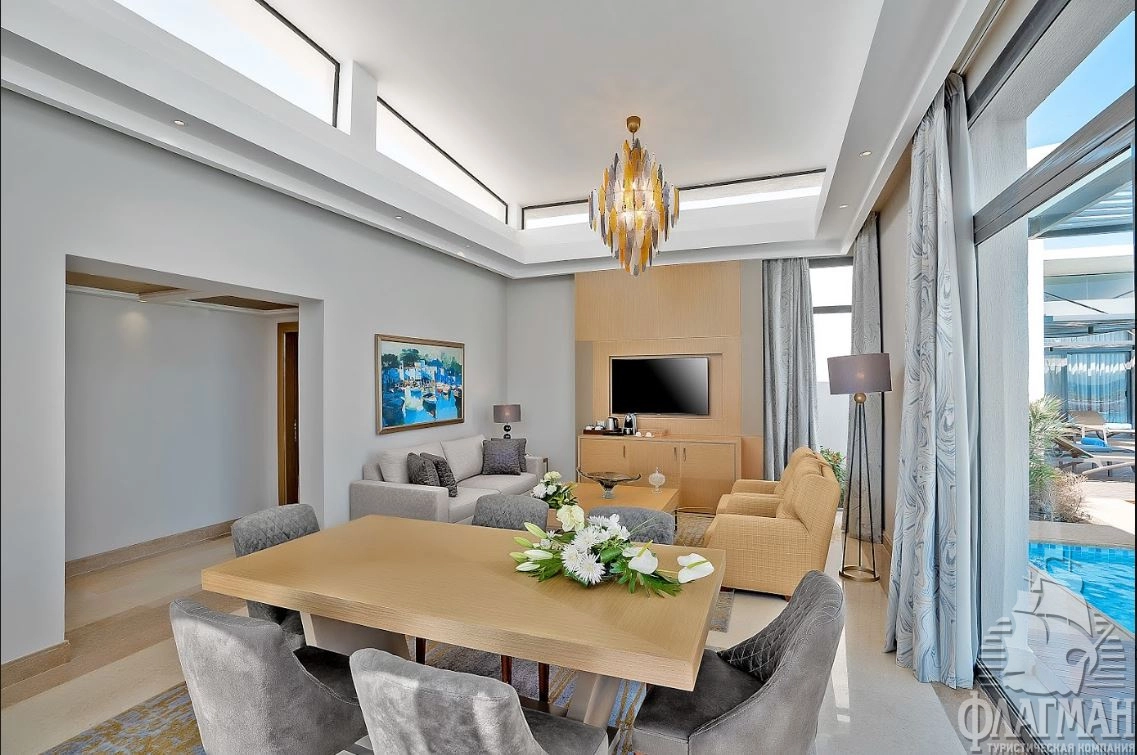 - Royal Villa (Sea & Pool View, 944 м², роскошная и полностью меблированная вилла с 2-мя спальнями с двуспальными кроватями и 2 комнаты с 2-мя односпальными кроватями, одна комната дворецкого, просторная гостиная, 4 ванные комнаты с отдельными душевыми кабинами, один гостевой туалет, полностью оборудованная кухня и холодильник, обеденная зона и комната для прислуги, 4 мини-бара, большая терраса, услуги личного дворецкого. Вилла имеет частный сад с бассейном и павильон на пляже, макс. 8+2 чел.