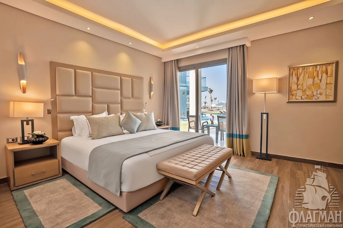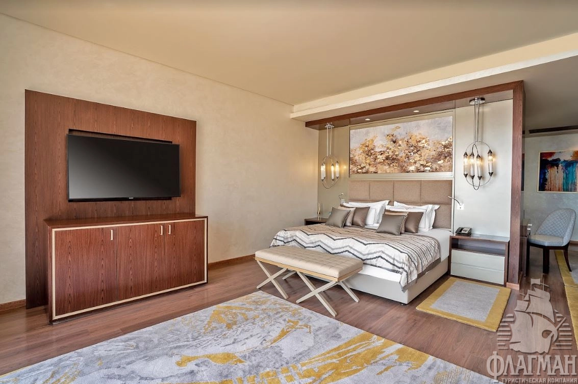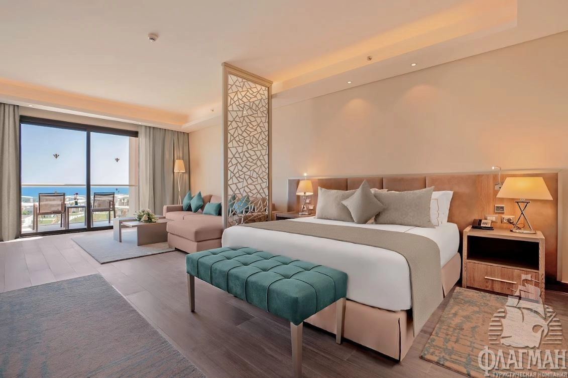 - Superior Suite (Sea & Pool View, верхний этаж, 140 м², гостиная+спальня, включая ванную комнату и балкон, макс. 2+2 или 3+1 чел.). Двуспальная кровать.