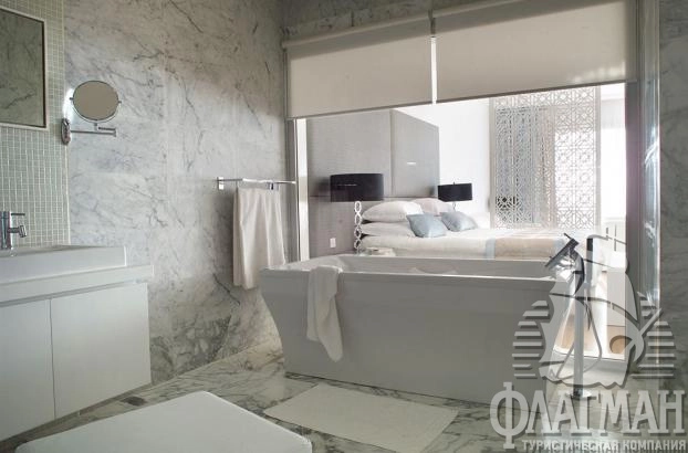 - 1 thalasso suite with jacuzzi, massage room and hammam (70 м2, спальня c гостиной зоной, межкомнатной двери нет, комната для массажа, в ванной комнате - хаммам, на балконе – джакузи, макс 2 чел.)
