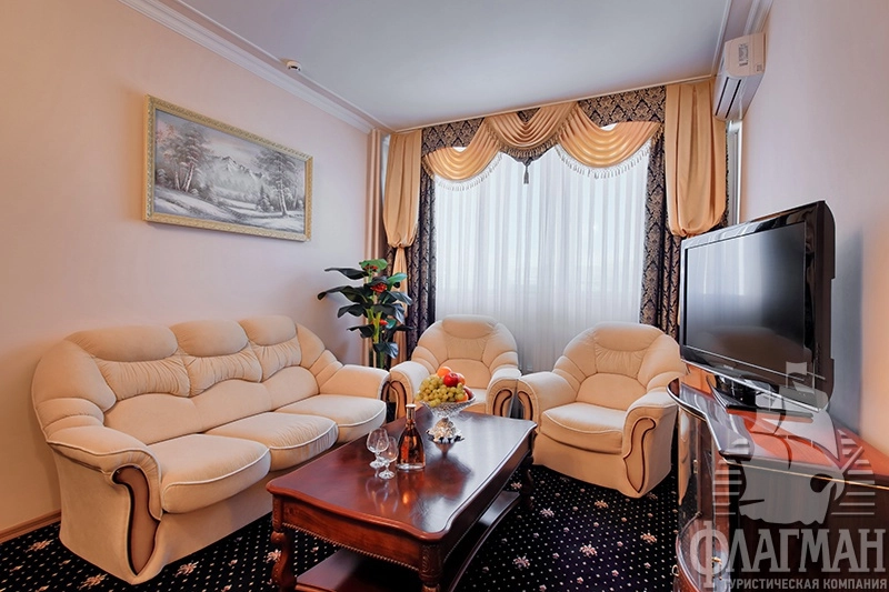 - 2-местный 2-комнатный люкс (макс. 2+1 чел., 39,3 кв. м, телевизор, спутниковое телевидение, кондиционер, ванна, туалет, джакузи, фен, халаты, тапочки, холодильник, телефон, мягкая мебель, утюг, гладильная доска, 2-спальная кровать, еврораскладушка).