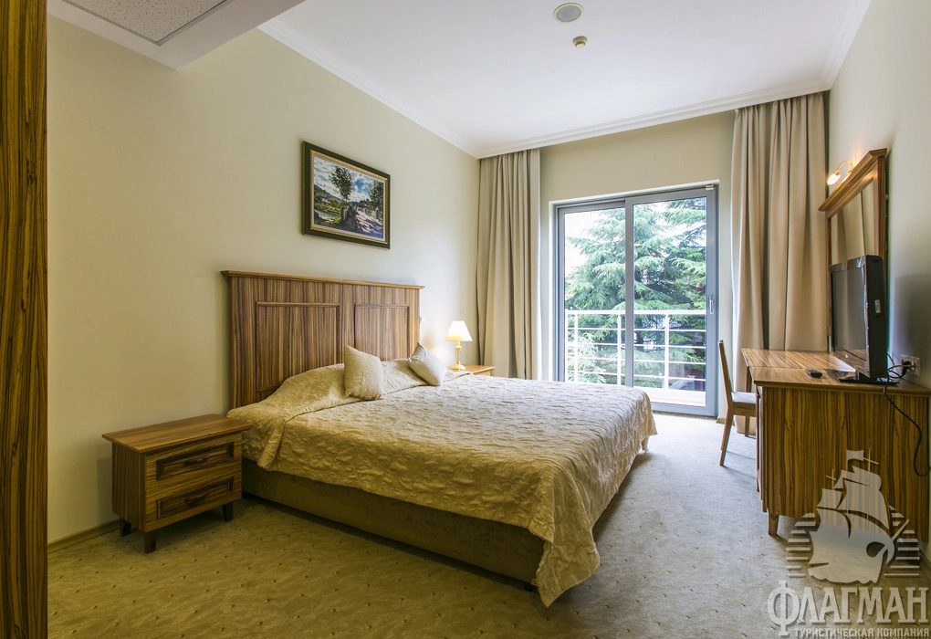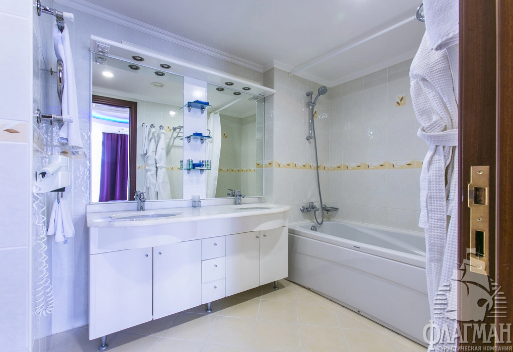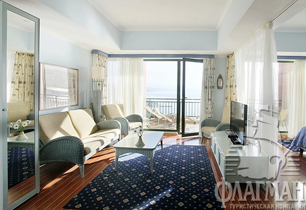- 2-местный 2-комнатный люкс (макс. 2+1 чел., 45 кв. м, Wi-Fi, ЖК / LCD телевизор, DVD-проигрыватель, кондиционер, ванна, туалет, фен, балкон, электрочайник, мини-бар, сейф, мягкая мебель, 2-спальная кровать, вид на море и парк. В номере две комнаты - гостиная и спальная). Доп. место - диван, может быть установлен без ограничения по возрасту.
