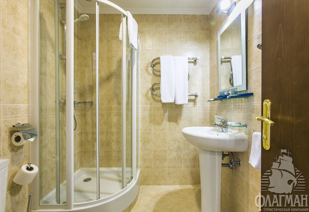 - 2-местный номер комфорт (макс. 2+1 чел., 27 кв. м, Wi-Fi, ЖК / LCD телевизор, кондиционер, душ, туалет, фен, балкон, электрочайник, мини-бар, сейф, телефон, 1-спальные/ 2-спальная кровать). Доп. место - еврораскладушка.