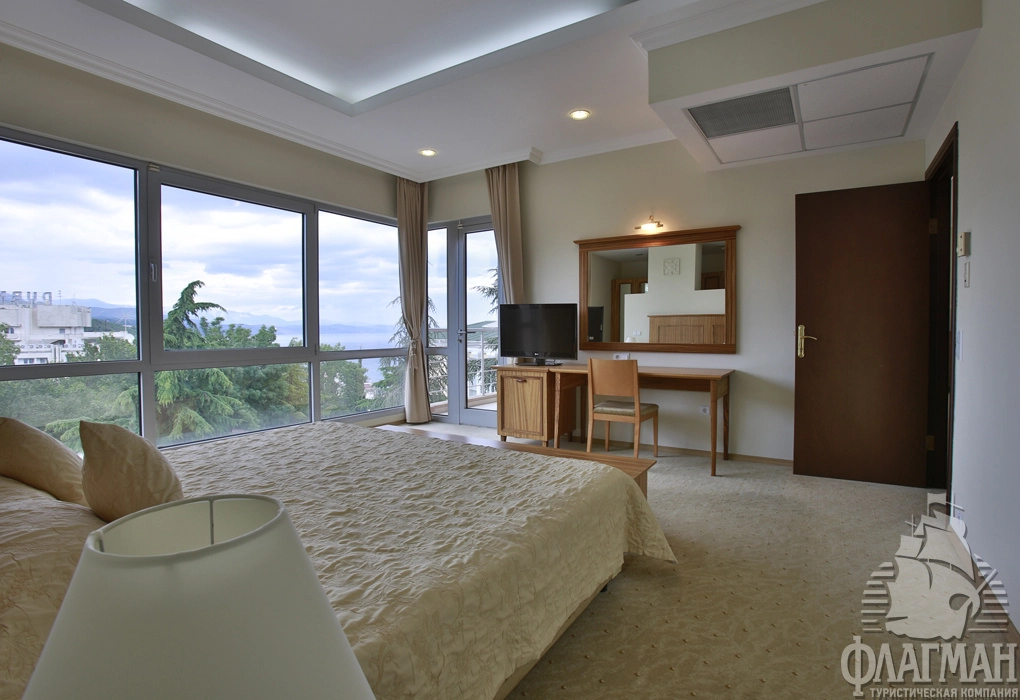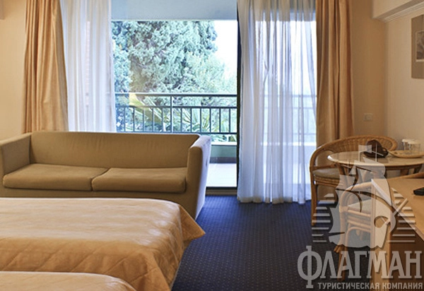 - 2-местный полулюкс (макс. 2+1 чел., 44 кв. м, Wi-Fi, ЖК / LCD телевизор, кондиционер, ванна, туалет, фен, балкон, терраса, электрочайник, мини-бар, телефон, мебель на балконе, 2-спальная кровать, вид на море и парк). Доп. место - диван, может быть установлен без ограничения по возрасту.