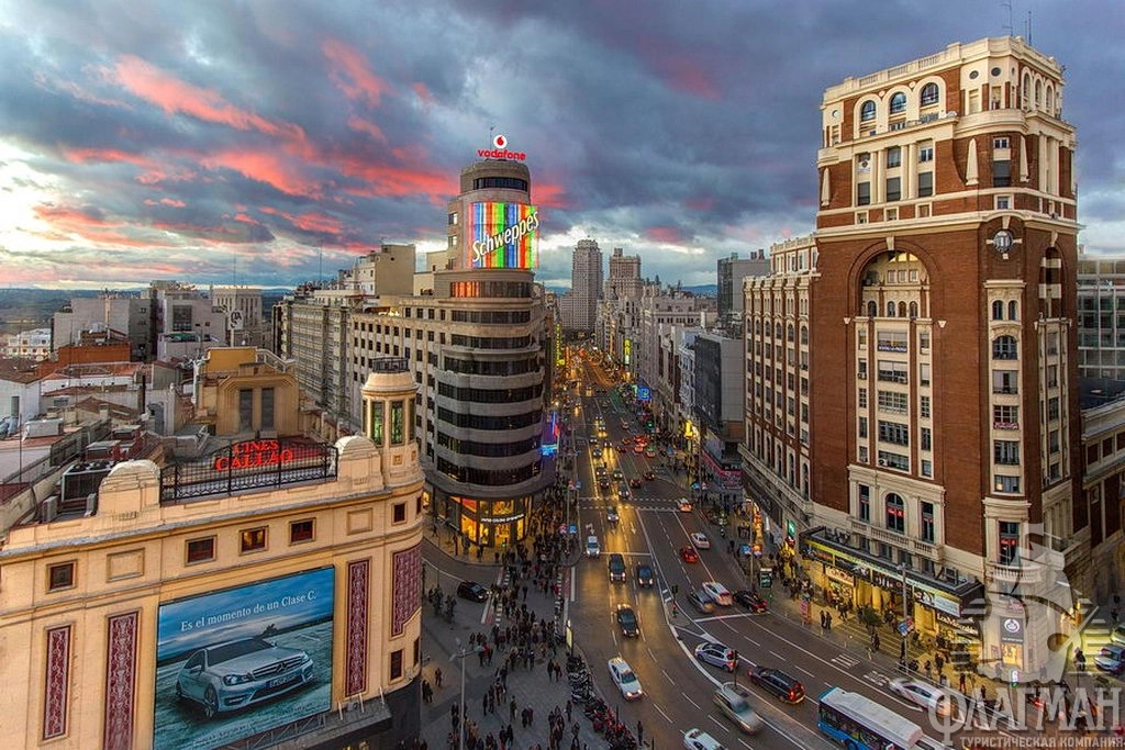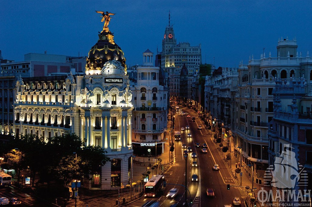 -  Обзорная экскурсия по Мадриду с осмотром проспекта Пасео-дель-Прадо, площади Колумба, площади Кастелья с «падающими башнями», улица Гран Виа, арены для боя быков Лас Вентас.