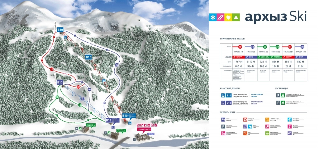 Схема горнолыжных трасс и расположение гостиниц в Архызе. Открывается в новом окне.