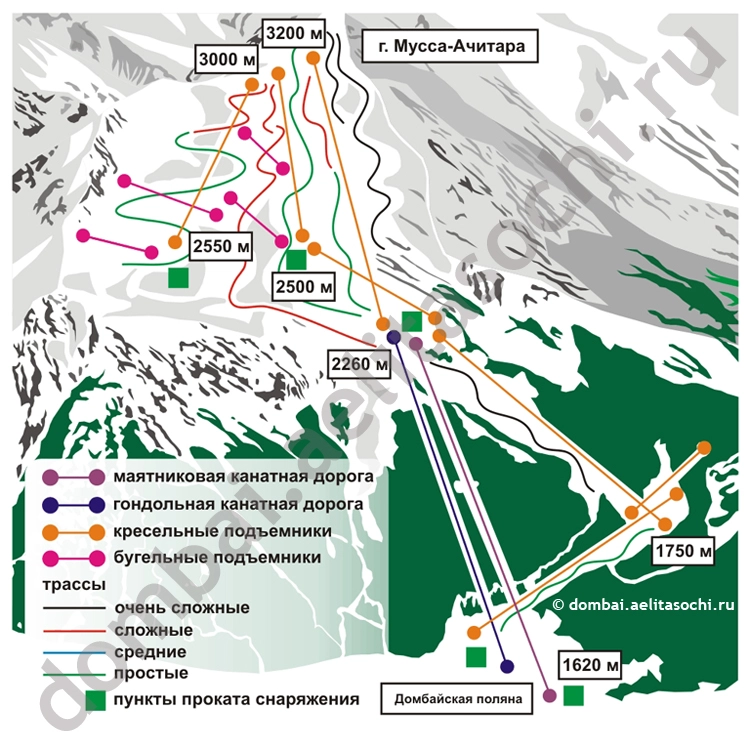 С первозданной красотой природы Домбая не сравнятся никакие другие горы. Воздух здесь целебный, пейзажи живописные. Любого класса отели, уютные частные гостиницы, рестораны, бары, боулинг-клубы, сауны сосредоточены на Домбайской поляне, прямо у подъёмников. Общая протяженность трасс 20 км, уровень сложности разный (включая детские). Юго-западные склоны Мусса-Ачитара считаются лучшими для катания. В Домбае широкие и достаточно пологие спуски, подходящие для новичков, но есть все условия для фрирайда и хели-ски (катание с вершин, на которые забрасывают вертолётом).