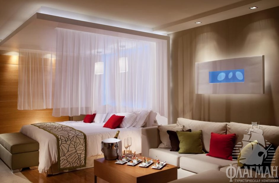 - junior suite SV (вид на море, однокомнатный номер, спальня с гостиной зоной, осн. кровать – двуспальная, макс. 2 чел., 42 м2),