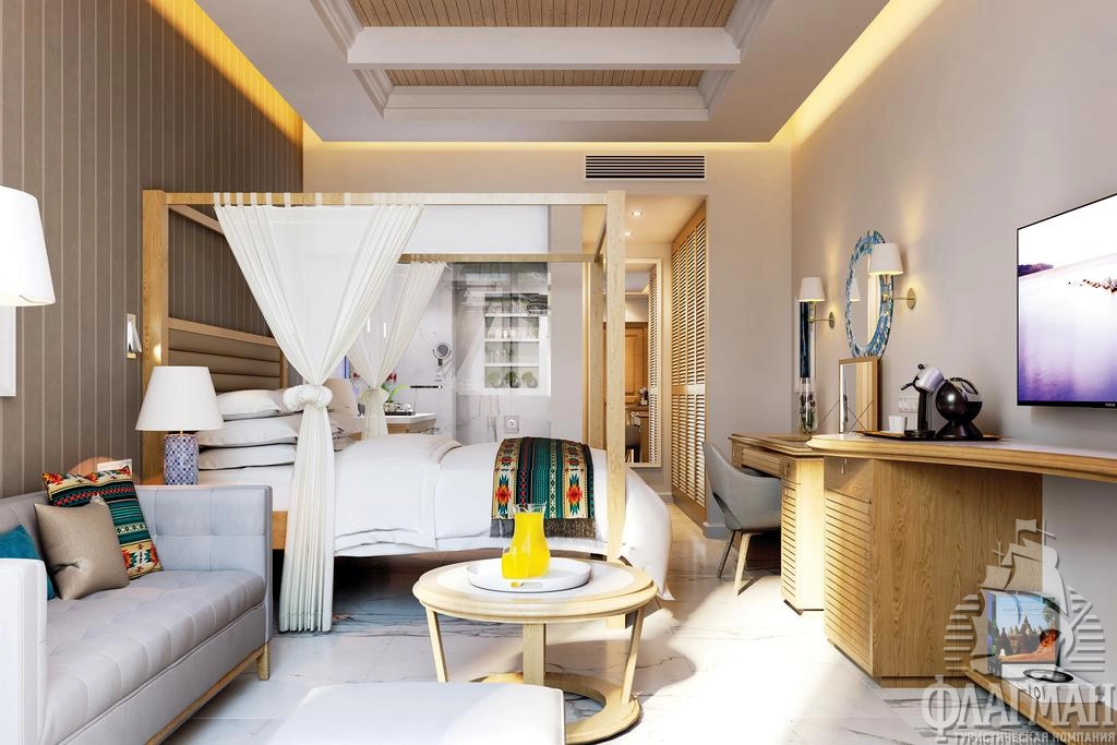 - Junior Suite Sea View (макс. 2 чел., 36 м2) - однокомнатный номер c гостевым уголком , ванная комната, балкон или терраса, вид на море.