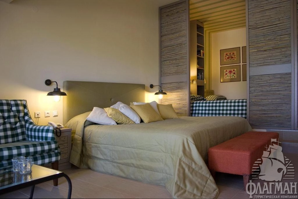- family room SV (вид на море, а также на бассейн, расположены в центральном здании, спальня с раздвижной дверью и гостиная, основная кровать – двуспальная или 2 односпальные, доп. – 2 диван-кровати, макс. 2+2 чел., 32,5 м2);