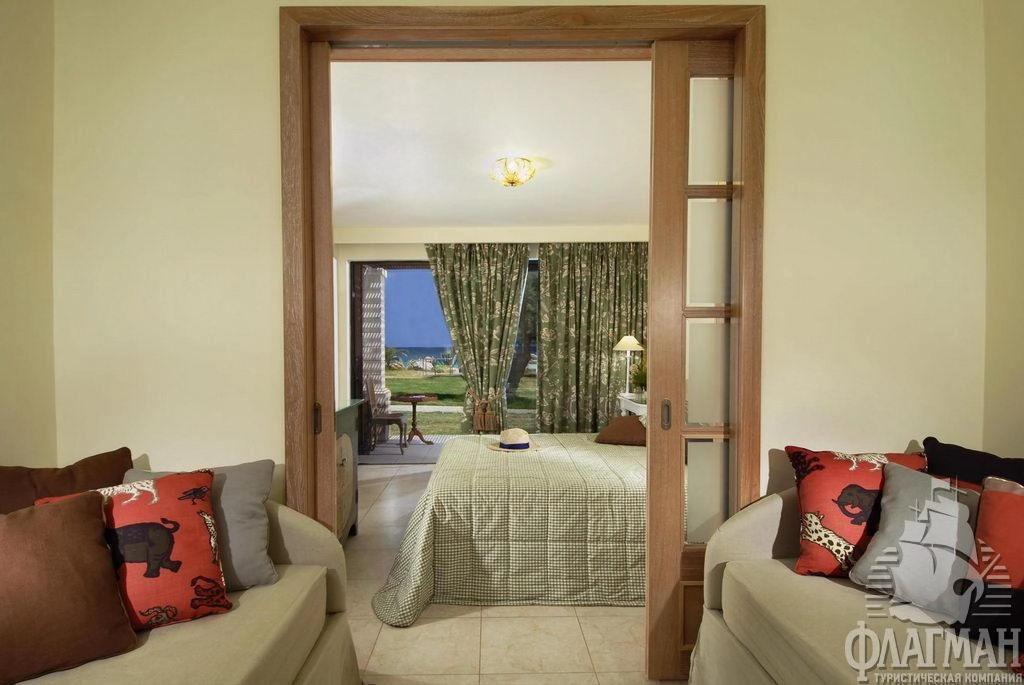 - junior bungalow suite WF (имеют выход на пляж, оформлены в критском стиле, спальня с зоной гостиной, основная кровать – двуспальная или 2 односпальные, доп. – диван-кровать, мраморная ванная комната, терраса с шезлонгами, макс. 3 чел., 60 м2),