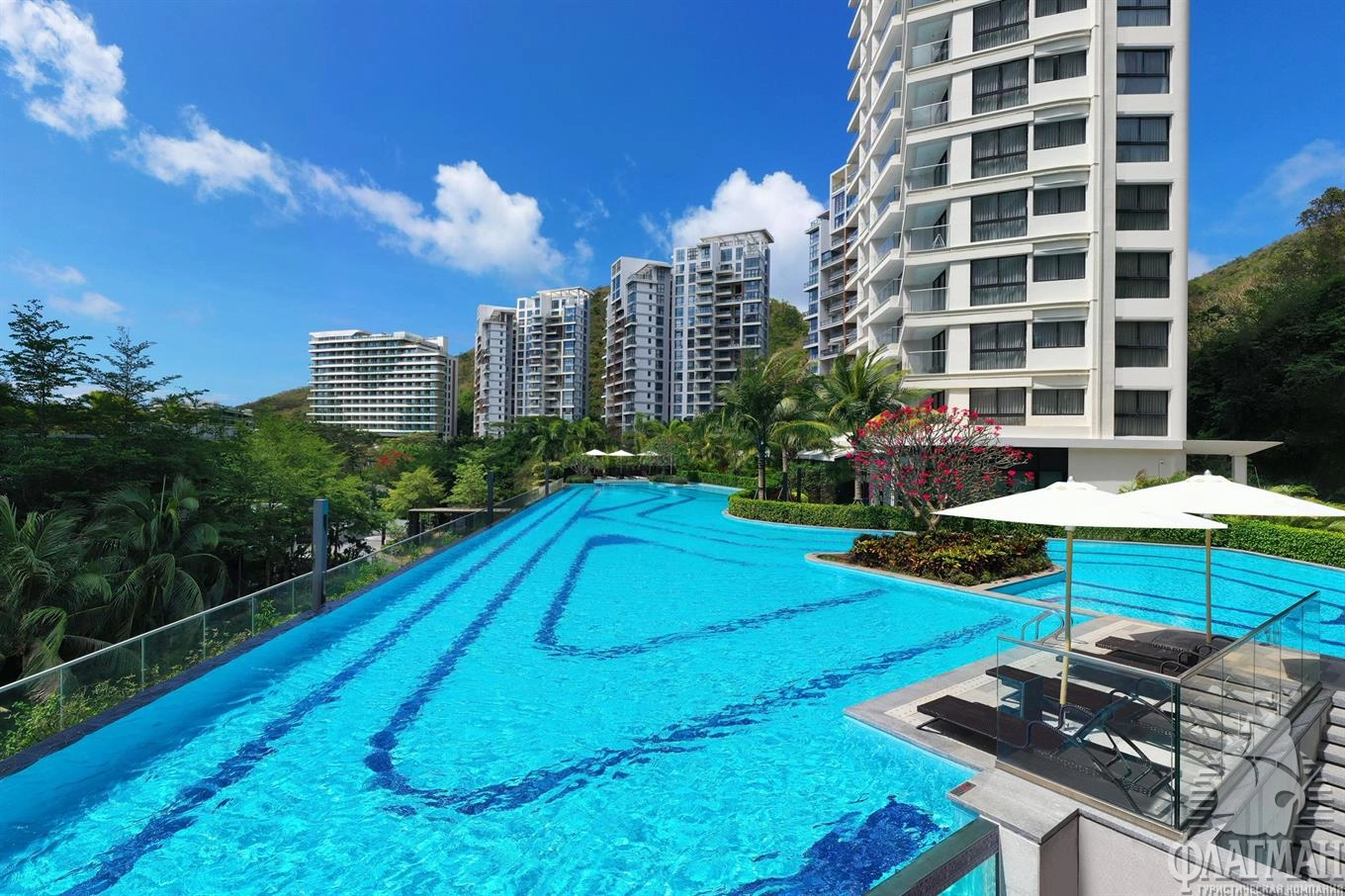 - у бассейна зонтики, шезлонги: бесплатно