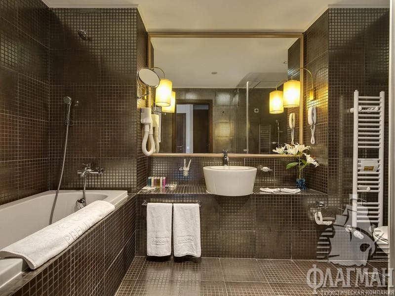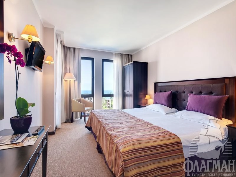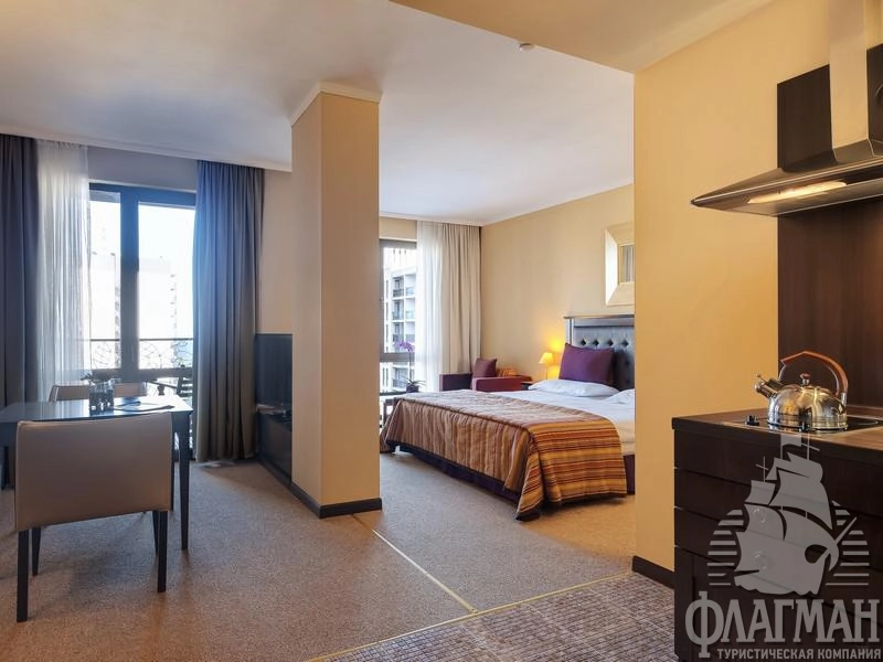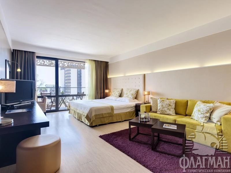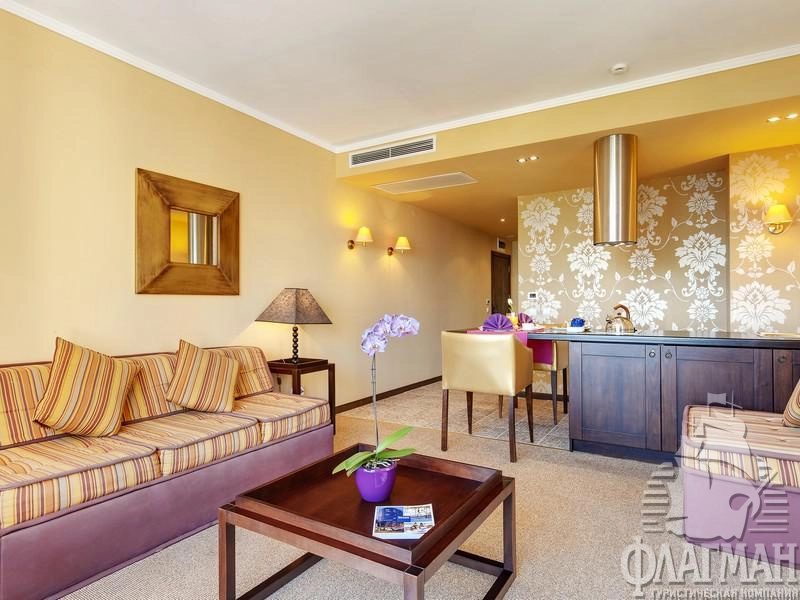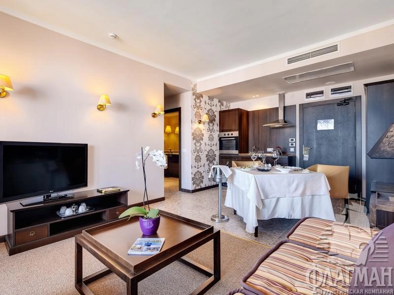 - Suite Executive (спальня с двумя сдвинутыми кроватями, гостиная с раскладным диваном, обеденным столом и кофеваркой, с дверью, 2 балкона, макс. 2+1 чел., 94 м2),