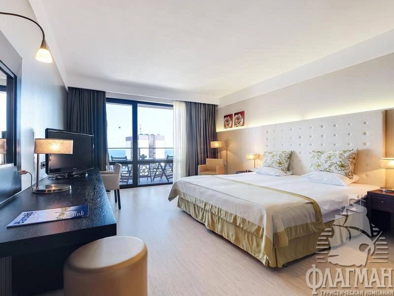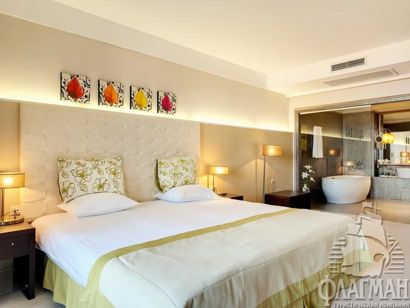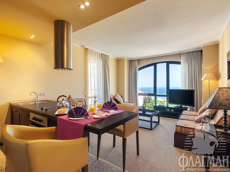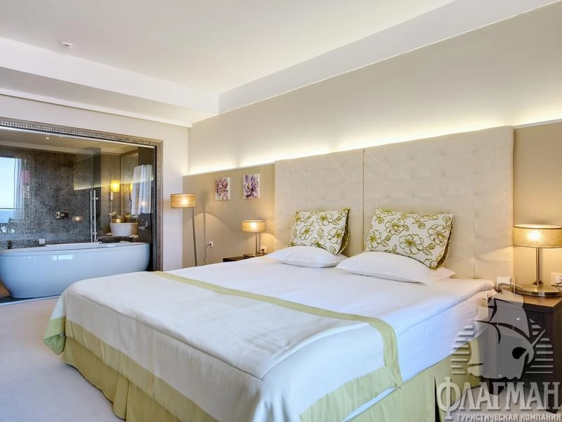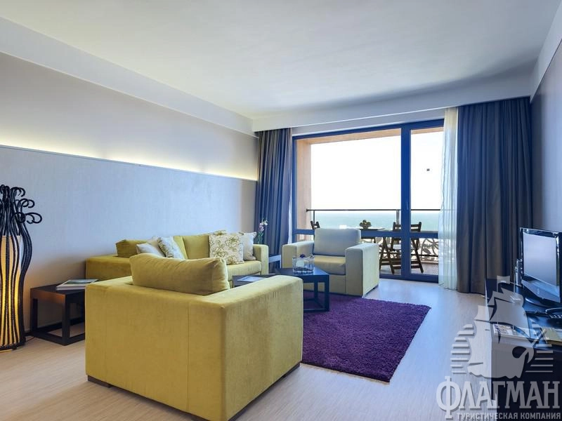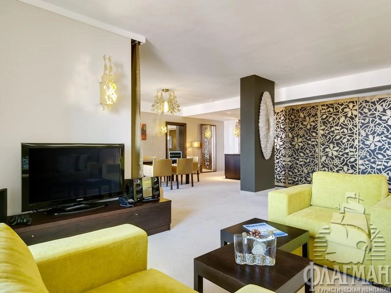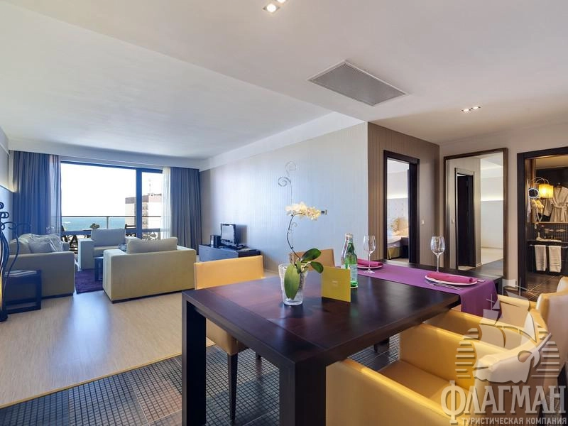 - Suite Residential 2 Rooms/ Suite Residential 2 Rooms pool view/ Suite Residential 2 Rooms sea view (спальня с 2-мя сдвинутыми кроватями и гостиная с разделительной дверью, раскладным диваном, кухнным блоком и обеденным столом; twinbeds – по запросу, макс. 2 взр. + 2 реб. или 3 взр., 52-65 м2),