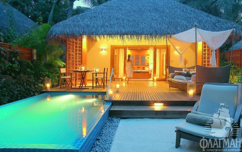 1 Baros Residence with Private Pool (268 м2, макс. 3 или 2+1 чел.). Уединенная отдельно стоящая просторная вилла на берегу, окруженная тропической зеленью: спальня с кроватью king-size, зона гостиной, частный бассейн (7x3 м), частный садик, ванна и душ в ванной комнате, ливневый душ под открытым небом, просторная веранда с тахтой для отдыха, небольшая коллекция книг и дисков.