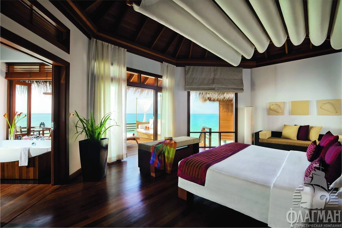 15 Water Villa (92 м2, макс. 3 чел.). Отдельно стоящие водные бунгало: спальня с кроватью king-size, зона гостиной, ванная комната с видом на океан, меблированная терраса с прямым спуском в воду.