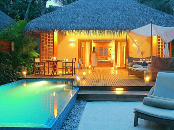 2 Baros Premium Pool Villa (160 м2, макс. 3 или 2+1 чел.). Отдельно стоящие просторные виллы на берегу: спальня с кроватью king-size, небольшой частный бассейн-каскад (3,4x2,4 м) и джакузи для двоих (1,7х1,7 м), собственный участок пляжа с шезлонгами, большая открытая деревянная терраса с тахтой для двоих и обеденным столом.