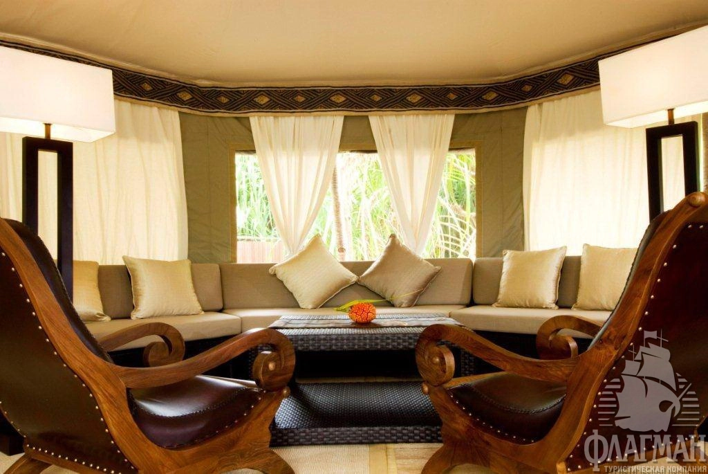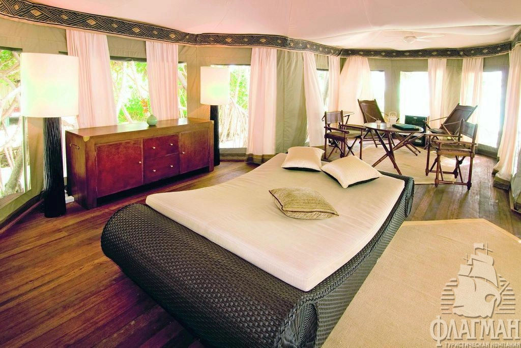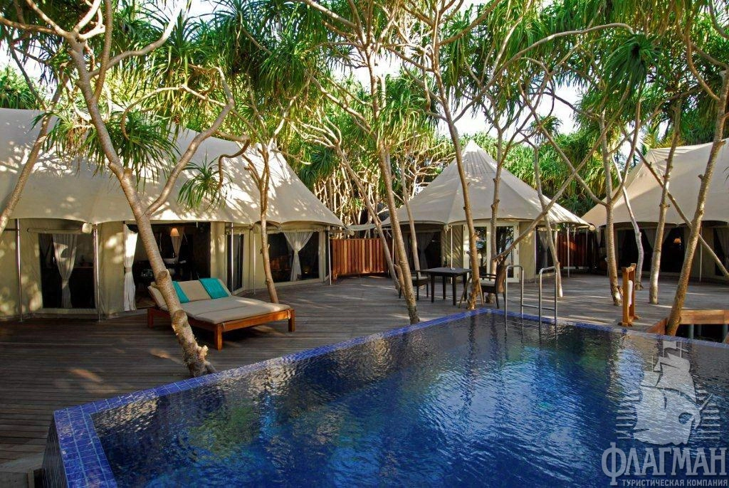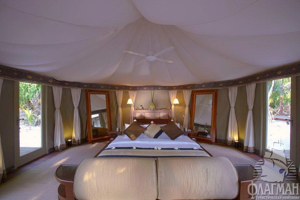 Роскошные, отдельно расположенные береговые виллы состоят из трех шатров: гостиная, спальня и ванная комната. В спальне кровать king size, дополнительная кровать для третьего человека устанавливается в отдельном павильоне гостиной. Деревянная мебель ручной работы. Собственный бассейн (21 м2) на открытой террасе.