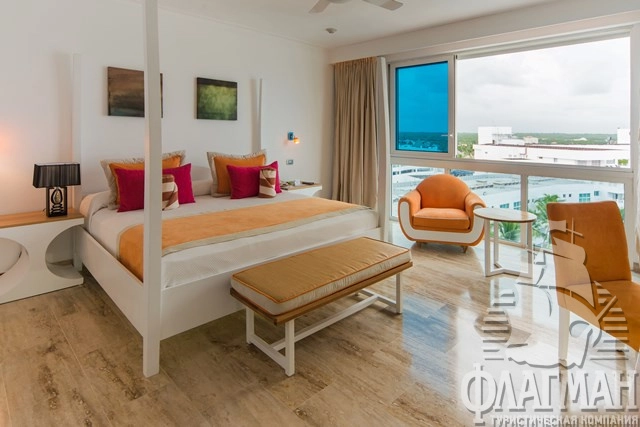 - Deluxe Room Sea View Hamaca Suites – 46 м2, Вид на океан, балкон, спальня с зоной гостиной. 1 кровать King size или 2 двуспальные кровати. Джакузи в ванной комнате. (Максимальное размещение 3 взр. или 2 взр.+1 реб.)
