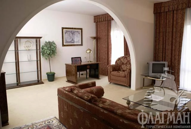 в номере: мебель, кабинет для работы, телевизор, DVD, кухня, холодильник, электрочайник, посуда, кондиционер, сейф, два санузла (один с ванной), фен, гладильная доска, халат, тапочки, предметы гигиены. Одно дополнительное место кресло-кровать.