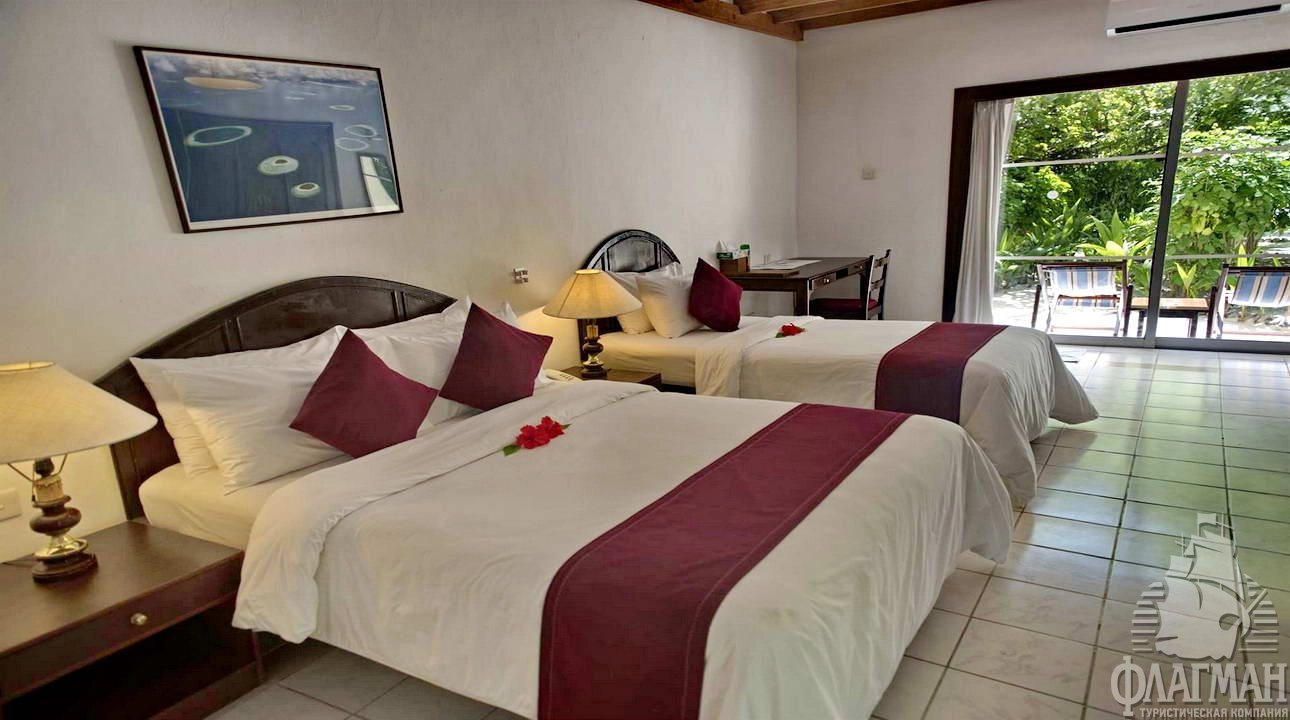 - Standard Room (30 м², макс. 4 или 2+2 чел.). Двухэтажные береговые бунгало расположены по периметру острова, в блоках по 16 номеров (8 номеров на каждом этаже). Прямой выход к морю. Спальня с кроватью king-size или двумя кроватями twin, ванная комната с душем, небольшая терраса в номерах на первом этаже и балкон – на втором.