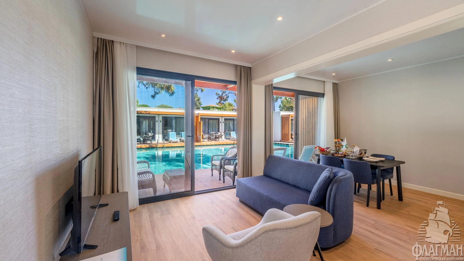 - 23 Swim Up Suite (гостиная, 2 спальни с межкомнатной дверью, 2 ванные, кухня, терраса, макс. 4 чел., 70 м2); Гости могут бесплатно пользоваться ресторанами A'la Carte во время своего пребывания.