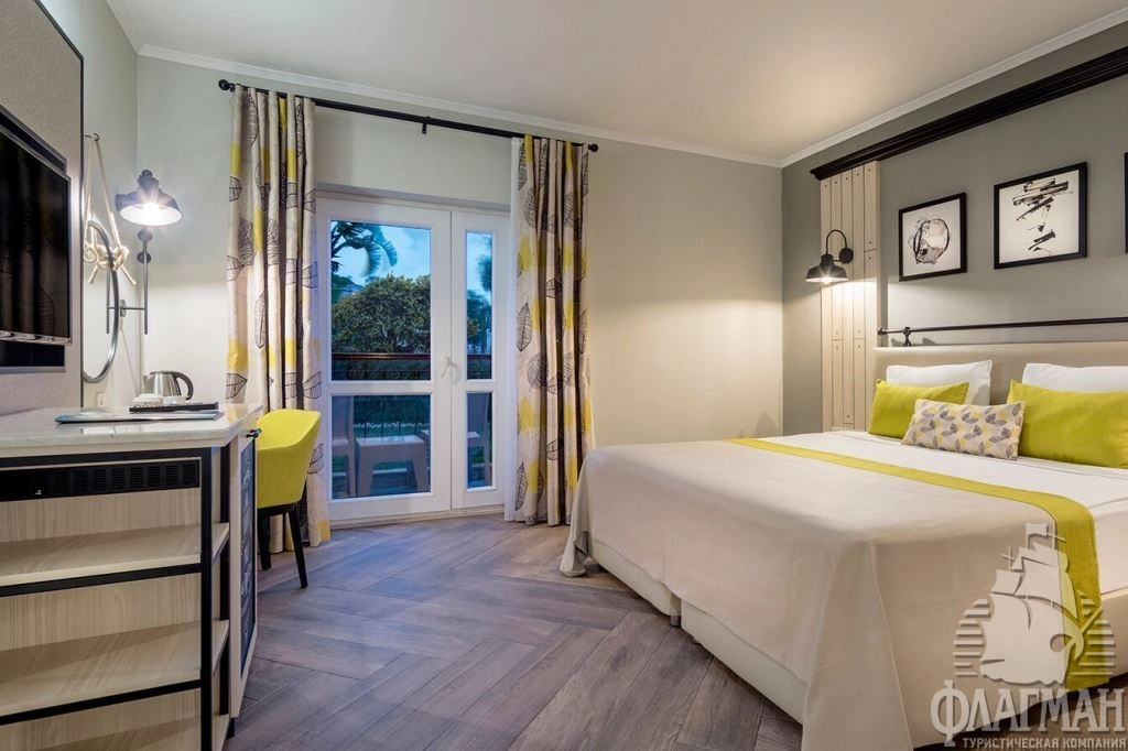 - 62 Deluxe Room (однокомнатный, двуспальная кровать 180х200 см/2 односпальных кровати 100х200 см + доп. кровать 90х200 см, балкон, ванная комната с душем, вид на бассейн/море, макс. 3 чел., 34м2); Гости, проживающие в номерах Делюкс, могут бесплатно посещать рестораны с обслуживанием по меню.
