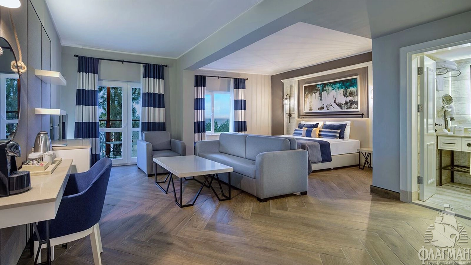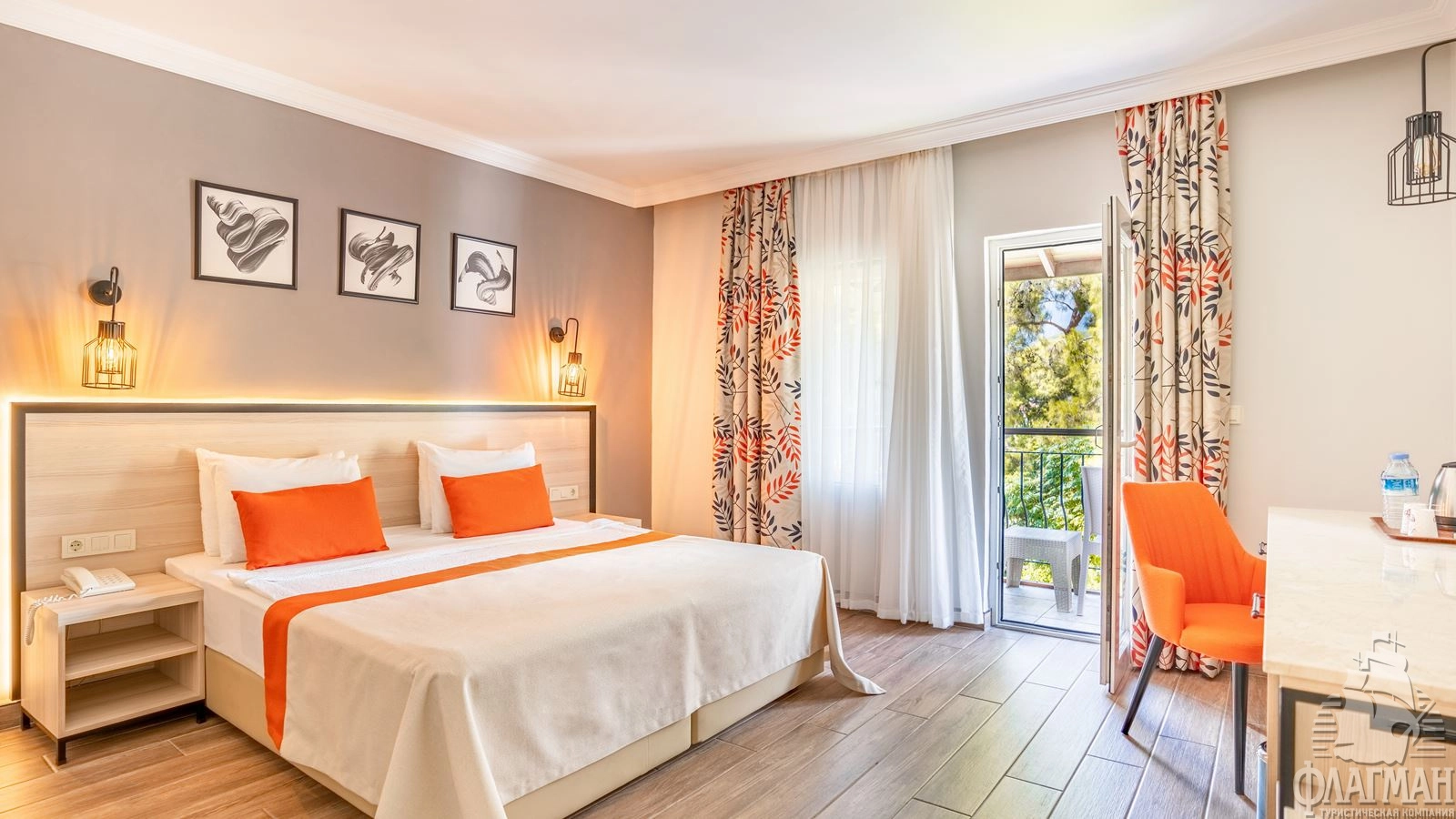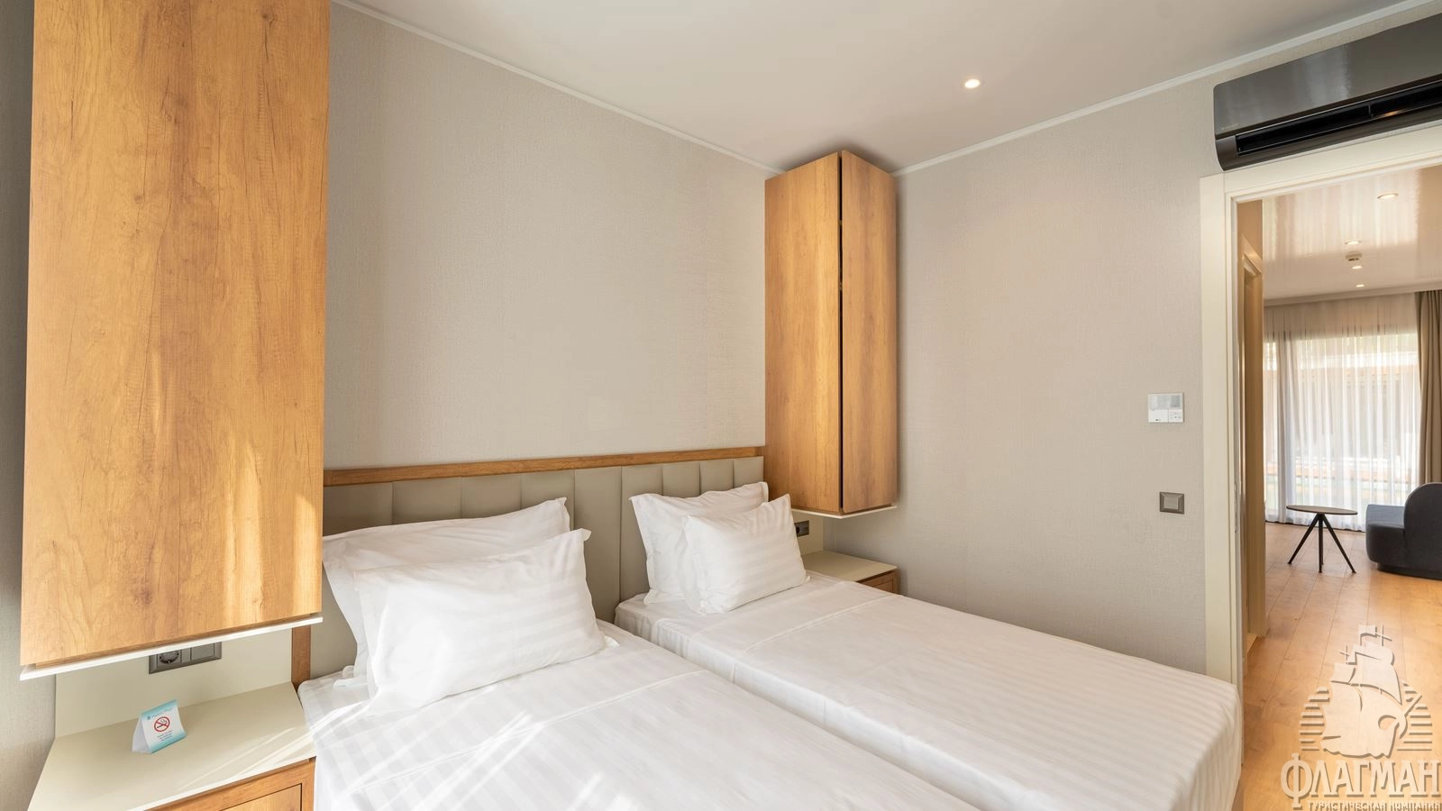 - 61 двухкомнатных Family Room (межкомнатная дверь, двуспальная кровать 180х200 см + 2 односпальных кровати 80х190 см, балкон, ванная комната с душем, вид на сад, макс. 2+2 чел., 35м2);