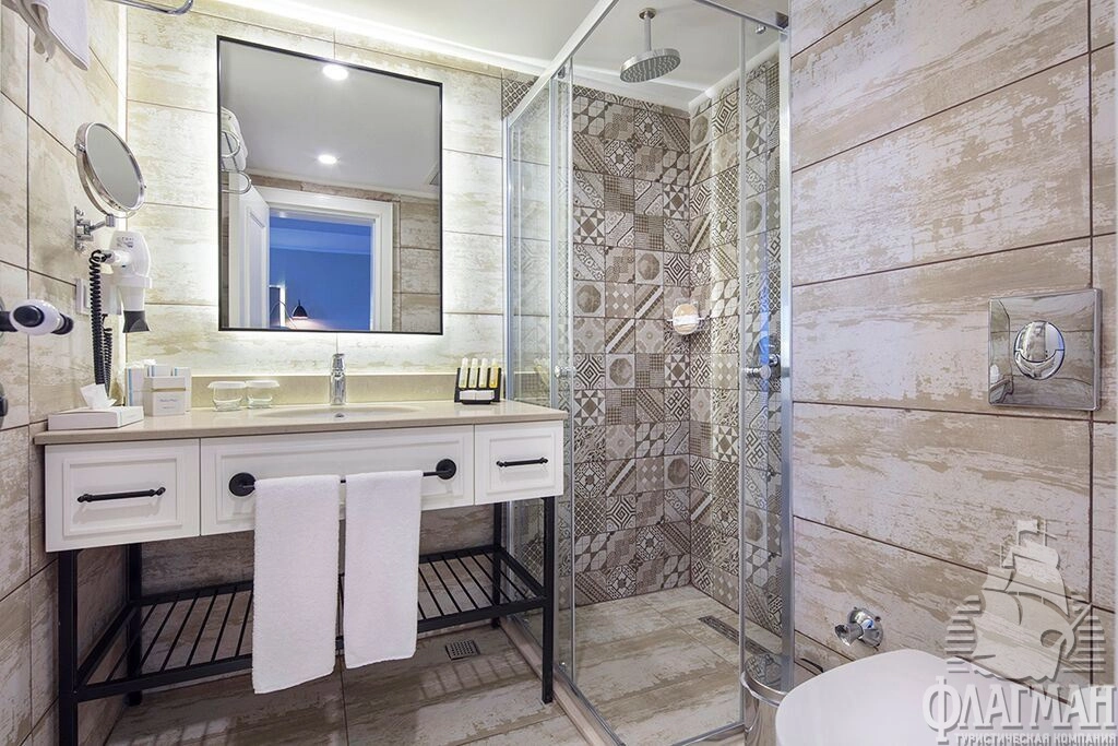 - 544 Premium Room (однокомнатный, двуспальная кровать 180х200 см/2 односпальных кровати 100х200 см + доп. кровать 90х200 см, балкон, ванная комната с душем, боковой вид на море/на бассейн, макс. 3 чел., 25 м2); Гости, остановившиеся в номерах категории Премиум, могут один раз бесплатно посетить рестораны A’la Carte.