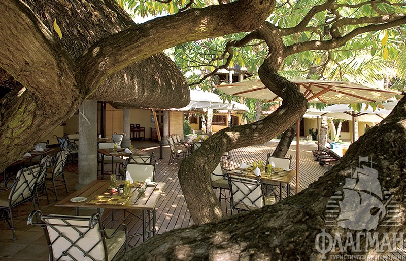 - 7 ресторанов (La Citronnelle – главный ресторан, завтрак и ужин, международная кухня / Blue Penny Cafe – ресторан высокой кухни, только ужины / La Spiaggia – легкие блюда, суши, сашими в обед, средиземноморская кухня на ужин / Deer Hunter – расположен в “Legend Golf Club House”, сэндвичи во время обеда, блюда стран индийского океана во время ужина / Indigo Beach Restaurant – сэндвичи, только в дневное время, периодически открыт на тематические вечера во время ужина / La Kaze – в обеденное время: шведский стол, салат-бар, гриль и пицца, в послеобеденное время: чай, кофе, кексы, морожное / Le Swing - расположен в “Links Golf Club House”, только в обеденное время сэндвичи, пицца, салаты)