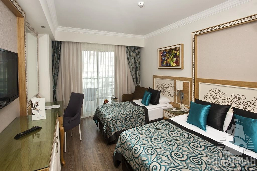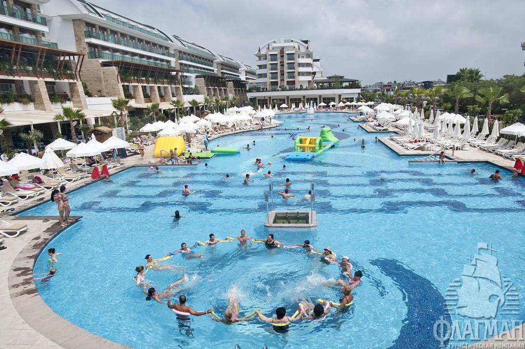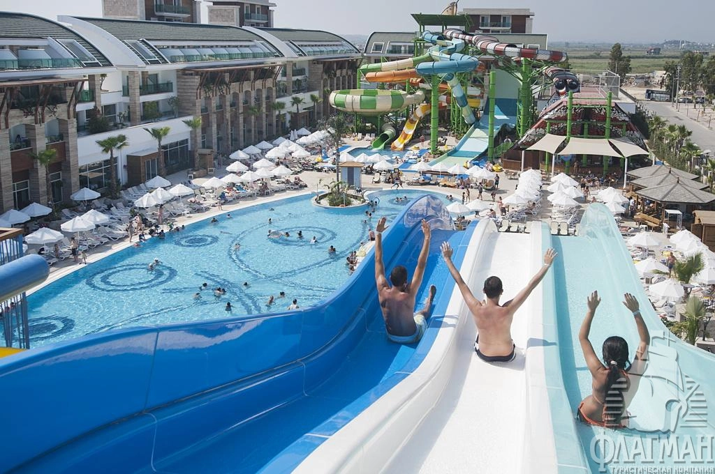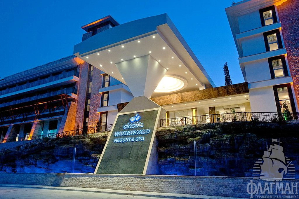 Кристалл Вотерворлд Ресорт и Спа 5* – новый отель, 2013 года постройки, в беклекском районе Серик, на самом берегу моря с песчаным пляжем длиной 500 и шириной 100 метров. Как следует из названия, главное достоинство отеля – большой современный аквапарк с водными аттракционами. Для взрослых работают несколько тематических ресторанов и баров, бильярдная, боулинг, тренажёрный зал и СПА-центр площадью 700 м2. Желающие могут научиться играть в гольф на поле расположенном неподалёку. Отель CRYSTAL WATERWORLD входит в гостиничную сеть “CRYSTAL HOTELS & RESORT” объединяющую качественные пятизвёздочные отели на основных пляжных курортах Турции. Подходит для спокойного семейного отдыха с детьми.