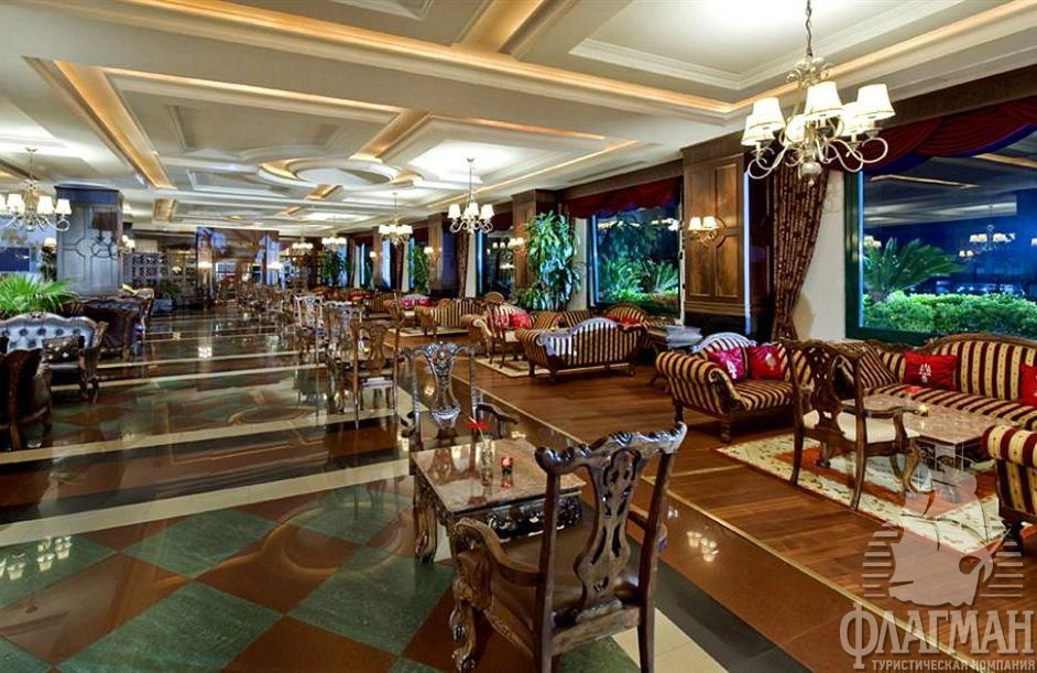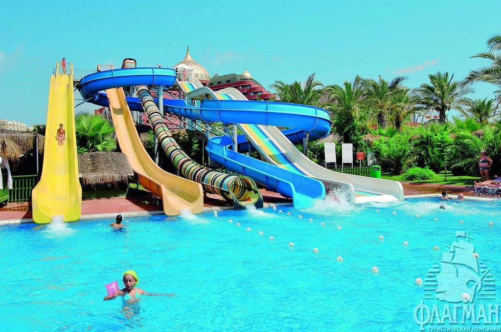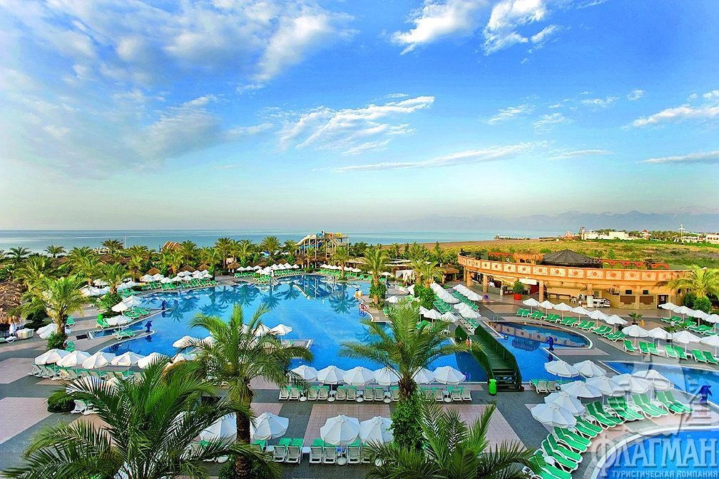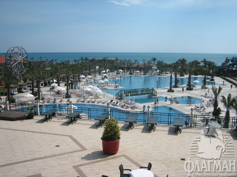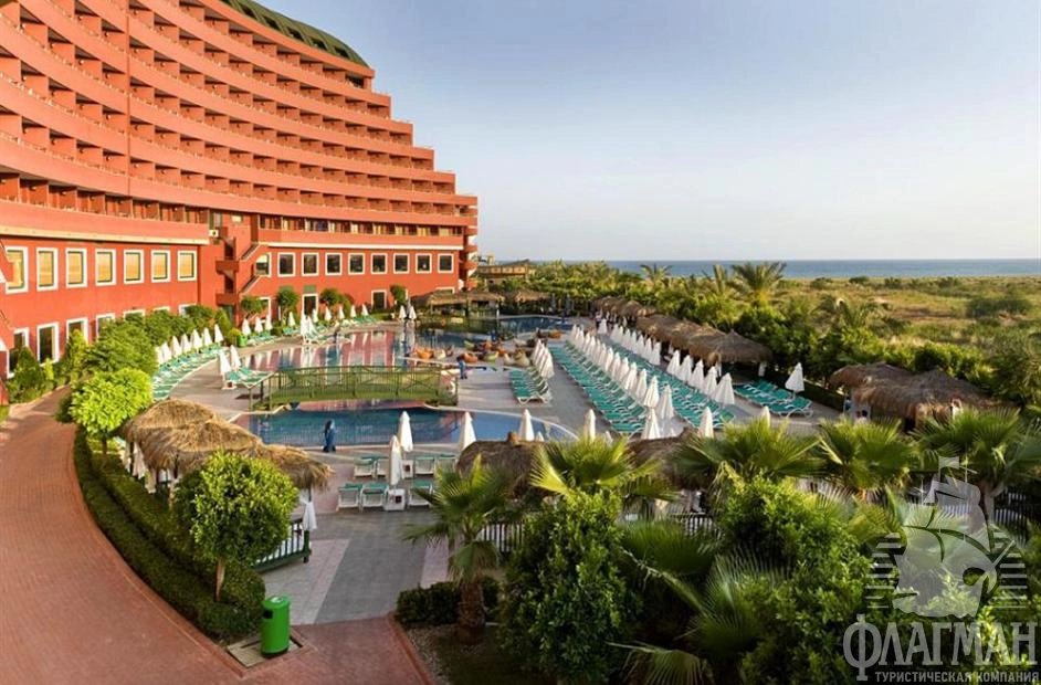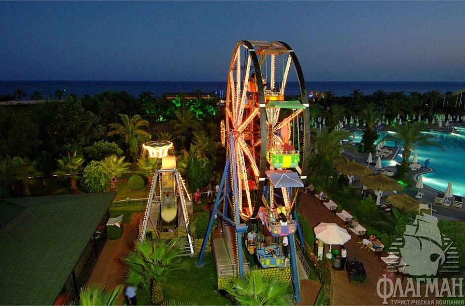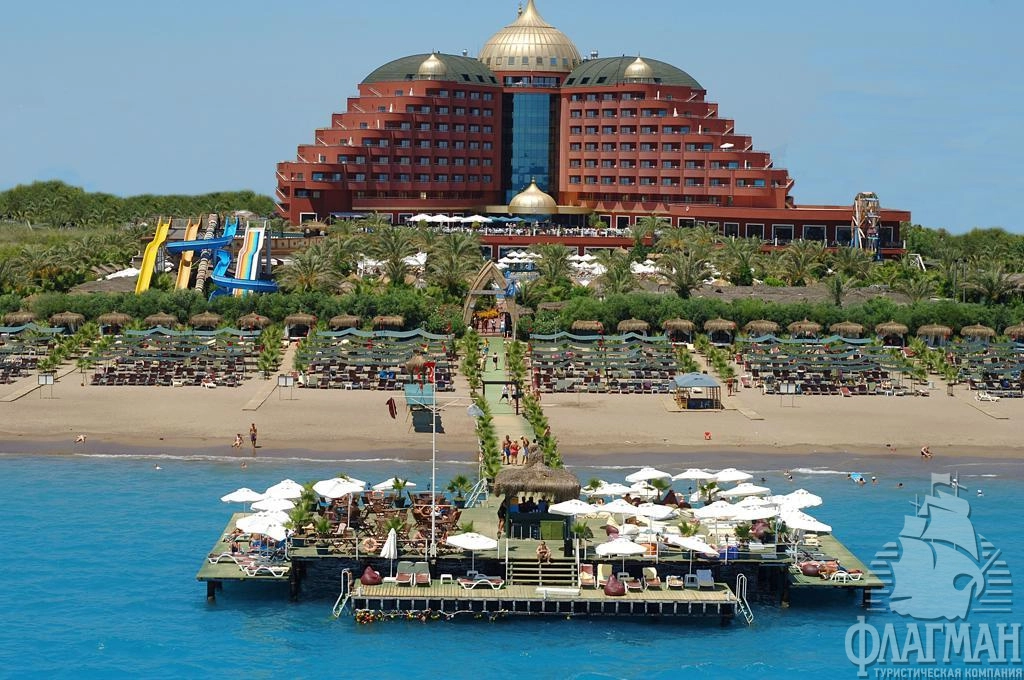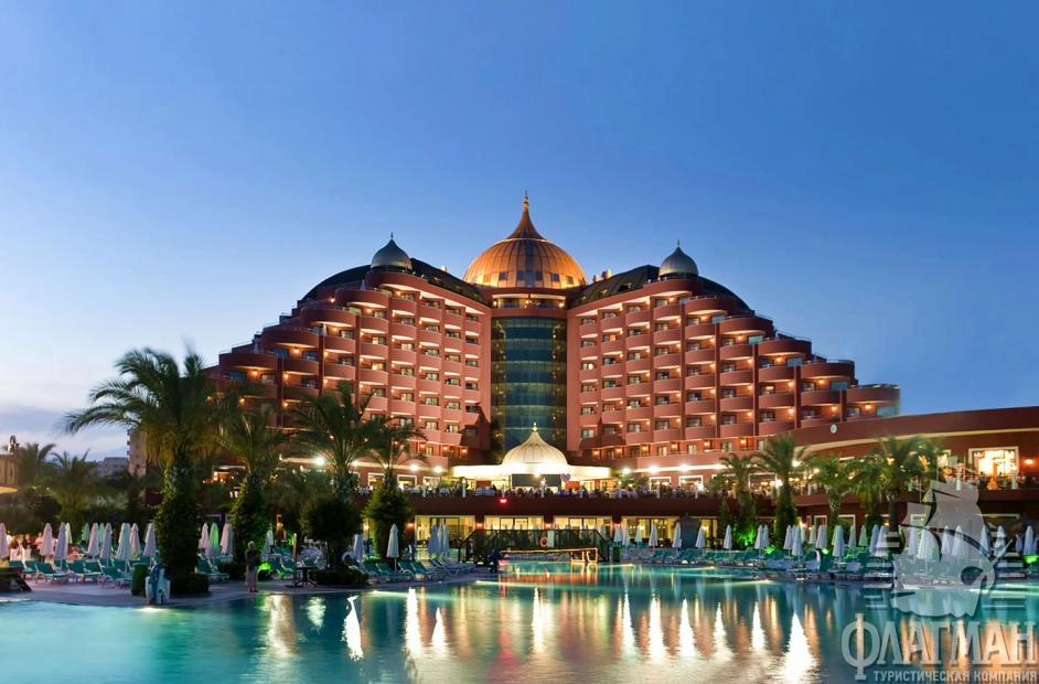 Дельфин Палас 5* – отель принадлежащий известной турецкой сети люксовых гостиниц Delphin Hotels. Интерьеры отеля выполены в османском стиле – богато обставленные номера с красными коврами, деревянными ретро-кроватями и зеркалами в позолоченных рамах. Как и полагается, здесь есть почти всё что нужно для отдыха: детские площадки с аттракционами, аквапарк с водными горками, бассейны, СПА-центр, фитнес, теннисные корты и боулинг. В гостинице большой выбор баров и a la carte ресторанов. Компактная, но очень зеленая территория. Активная анимация в течении всего дня и вечером. Отдых в отеле рекомендуется для семей с детьми самого разного возраста.