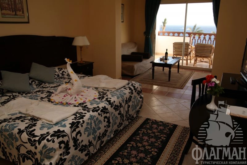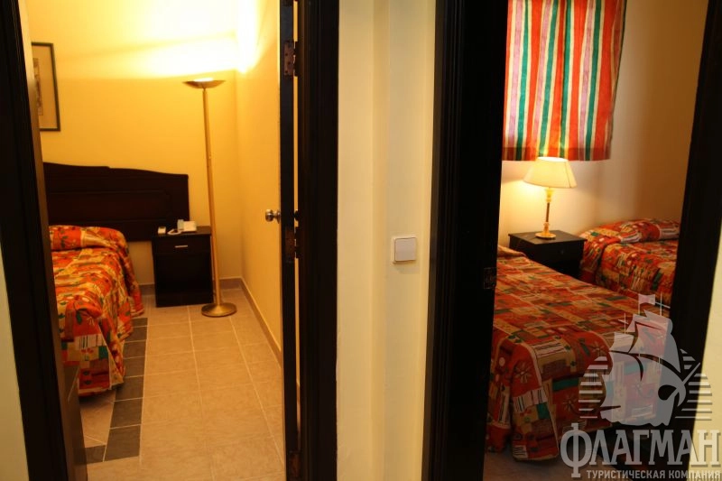 - Family Room - 30 номеров. Площадь 34 кв.м. 2 спальни, есть межкомнатная дверь. Терраса. Покрытие пола - кафель. 2 одноместные кровати или 1 двухместная. Дополнительное спальное место (кровать/софа). Индивидуальный кондиционер, мини-бар (вода, пополняется ежедневно), сейф, ТВ. Душ, фен. Платно: телефон. Уборка номера: ежедневно. Смена белья: 2 раза в неделю.