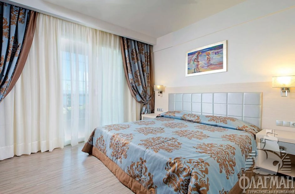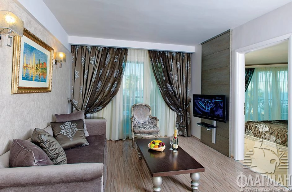 - deluxe suite SV (вид на море, 2 спальни и отдельная гостиная, осн. кровать — king-size кровать, доп. - 2 односпальные и софа, макс. 4+1 чел., 60 м2).