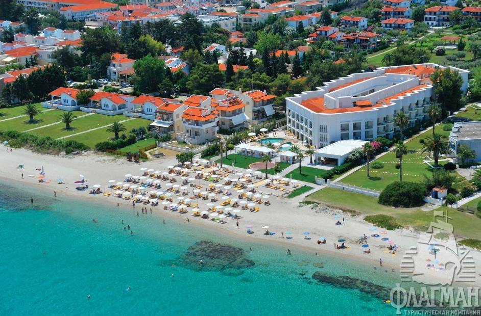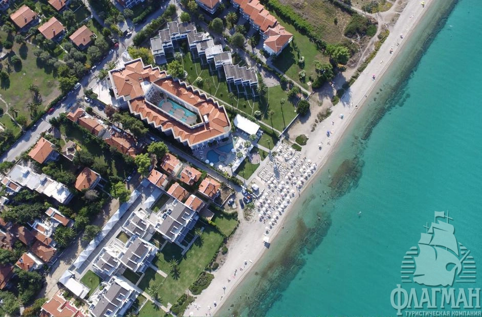 Расположен на юго-востоке полуострова Кассандра, в 300 м от центра поселка Ханиоти, в 90 км от аэропорта г. Салоники, на берегу моря.