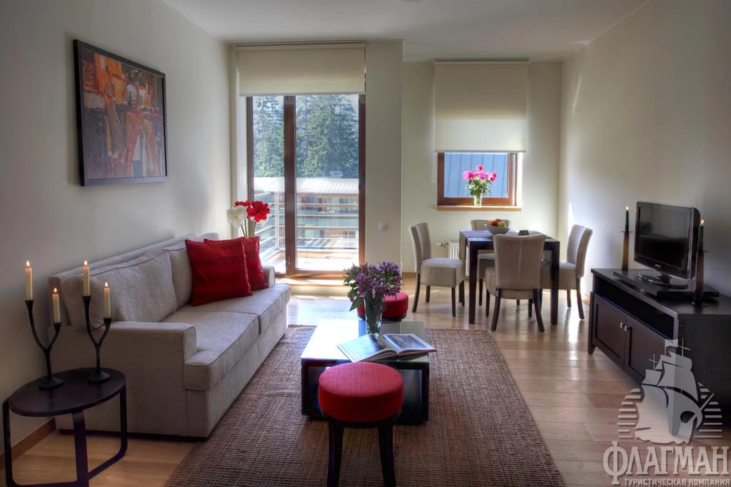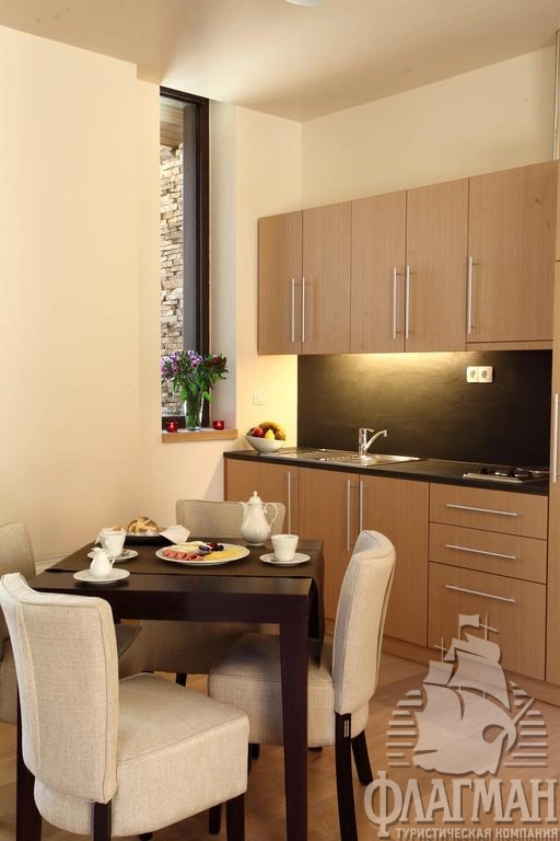 - Studio (одно помещение с двумя односпальными кроватями, доп. место – раскладная кровать, кухонный уголок с мойкой, плитой, холодильником и обеденным столом (не разрешается готовить), ванная комната с душем, макс. 2+1 чел., 35-38 м2);
