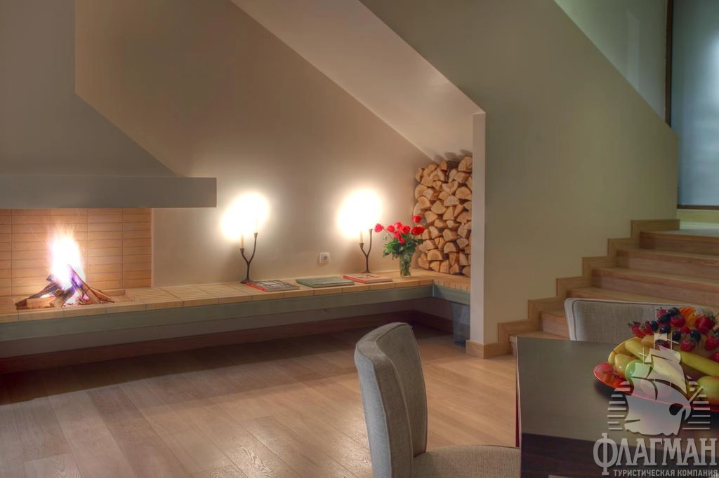 - Villa 2 Bedrooms (2 этажа: на первом - гостиная с раскладным диваном и кухонным уголоком с мойкой, плитой, холодильником, обеденным столом (не разрешается готовить) и камином; на втором - две спальни с одной двуспальной кроватью в каждой, есть межкомнатная дверь, 2 ванных комнаты с ванной, макс. 5 чел., 130-150 м2)