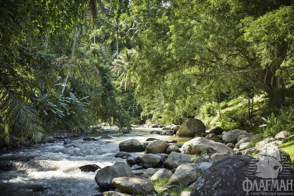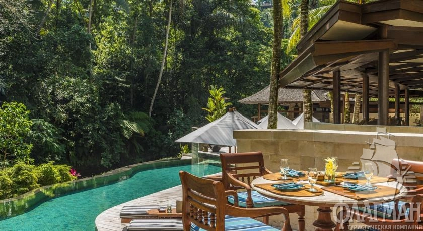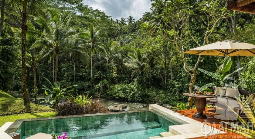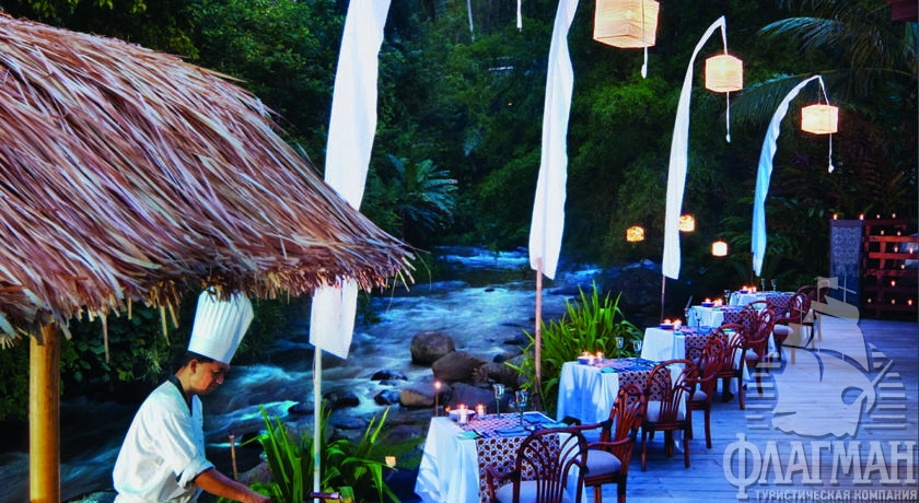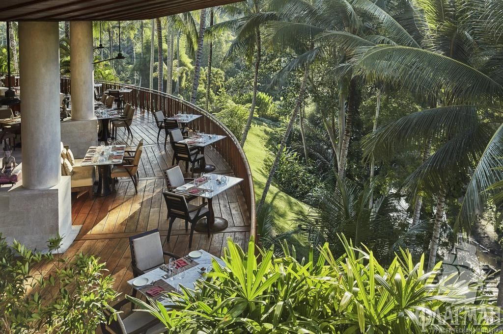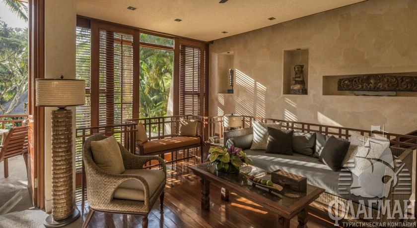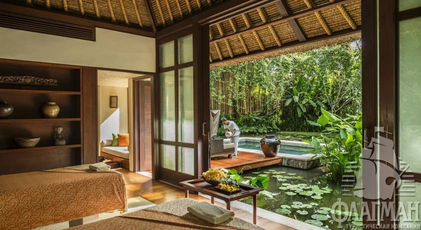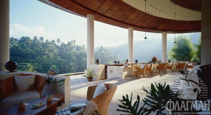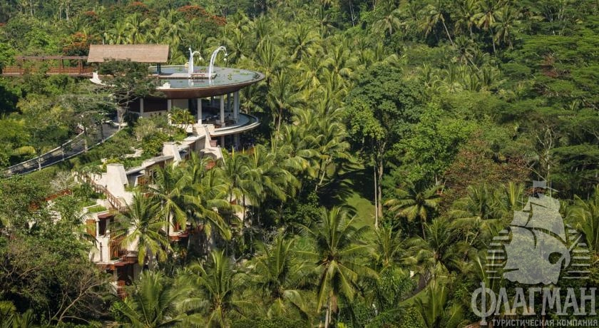 Расположен в 35 км от аэропорта, на курорте Убуд, среди жипописных рисовых полей.
