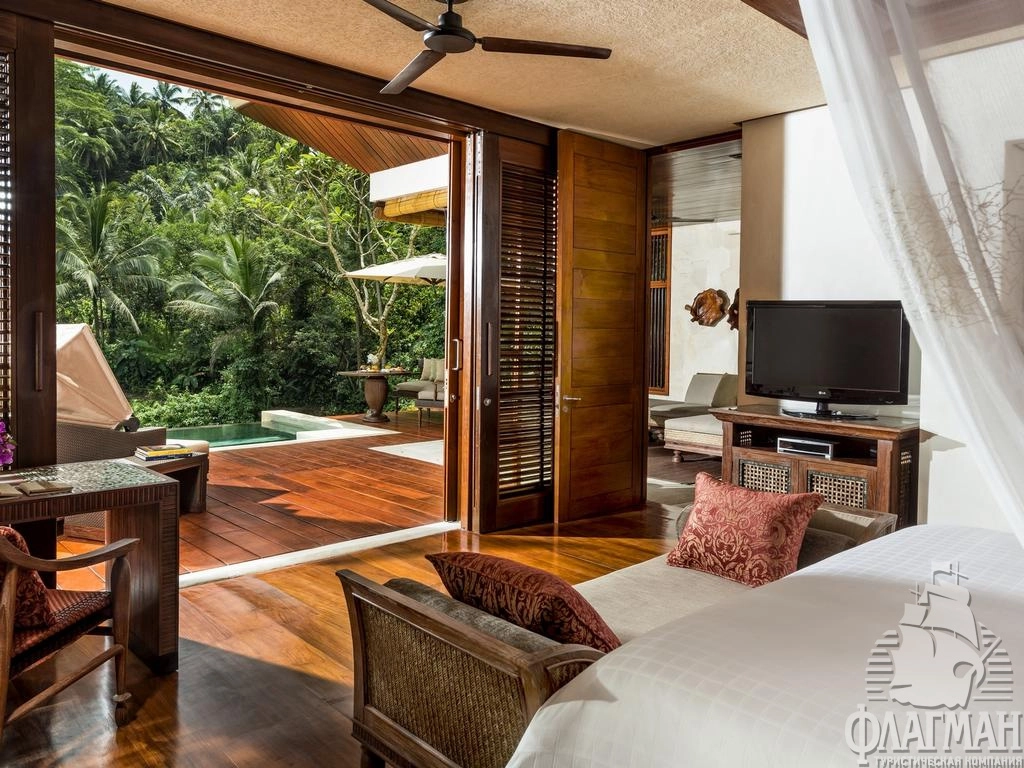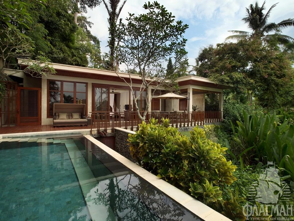 - 2 Sayan Villa (312 м2, расположена на самой высокой точке отеля, отдельная регистрация гостей, отдельный въезд на территорию виллы. Гостиная с зоной столовой, спальня, терраса, открытый бассейн, сад)
