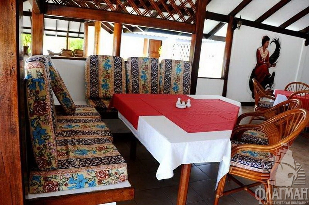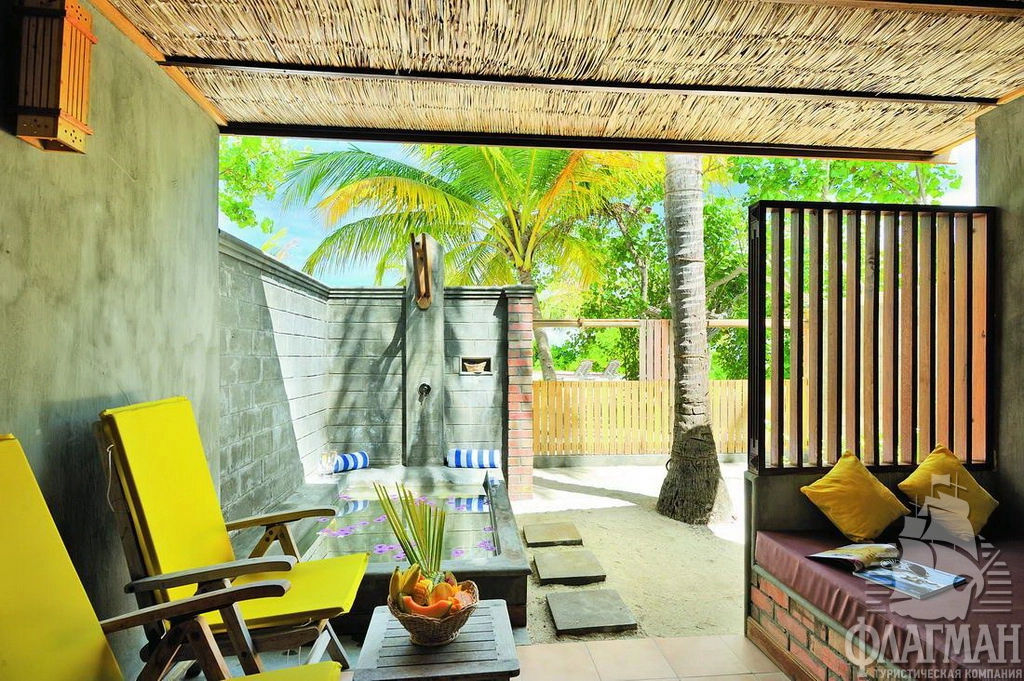 8 Deluxe Room (25 м2, макс. 2 чел.). В дополнение к оснащению номера Beach Front Room имеется телевизор, ванна частично на открытом воздухе, душ под открытым небом, собственный мини-садик, фен.